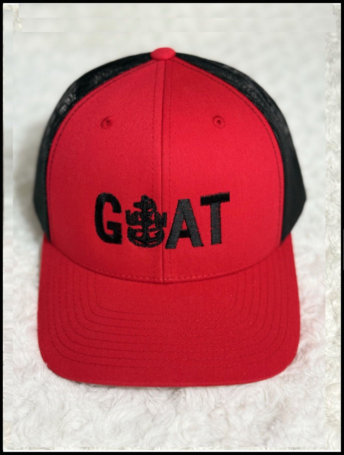 Red and Black Trucker Hat GOAT with USN Anchor in all Black Thread.