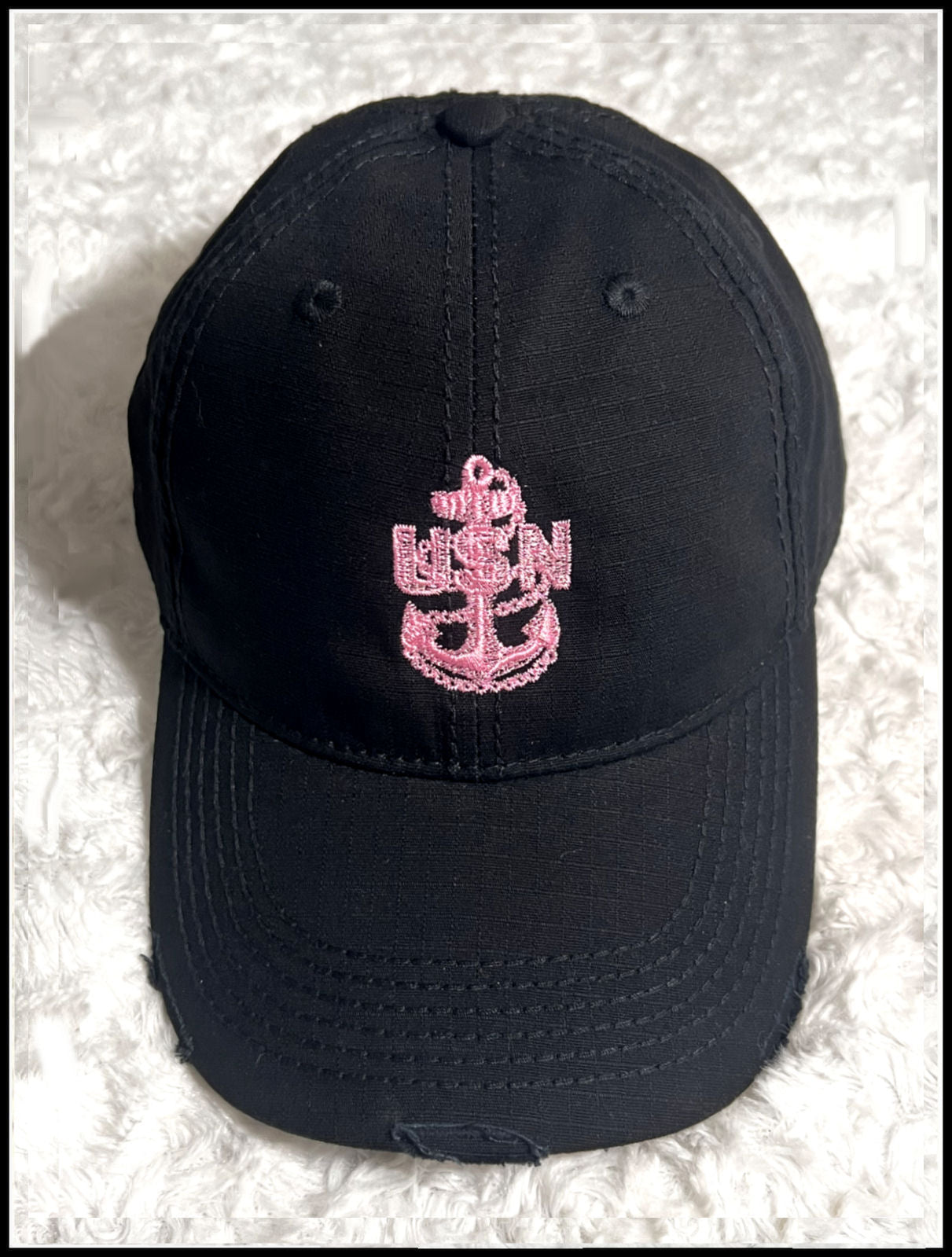 Black hat with Pink Thread USN Anchor. Optional “Chick Chief" or “Retired” Embroidery on the back of the hat. Hats are adjustable, one size fits most.