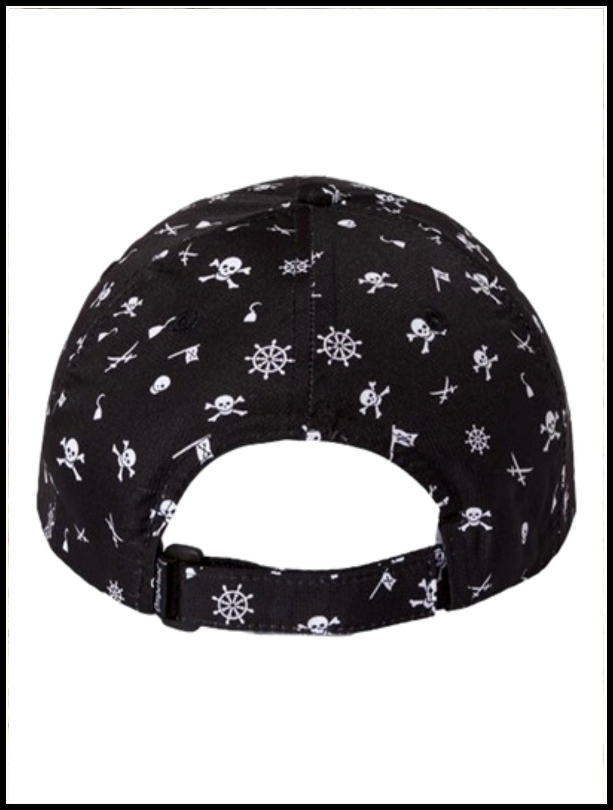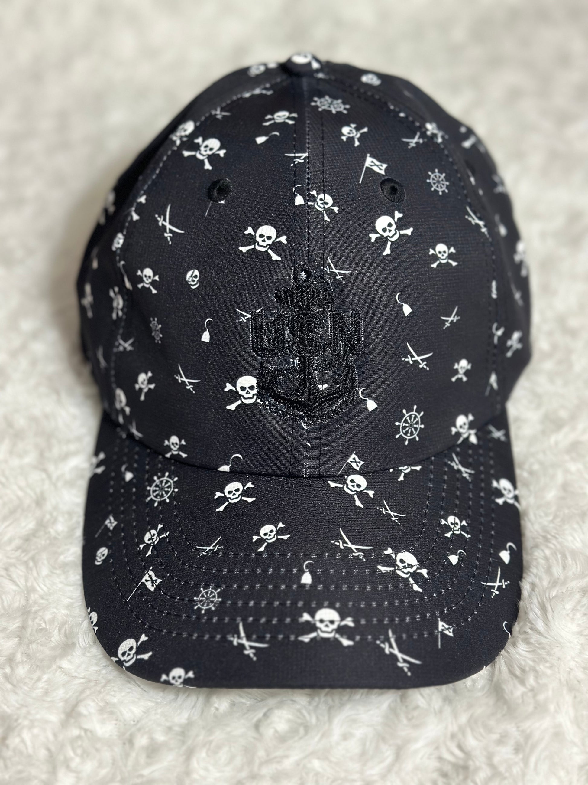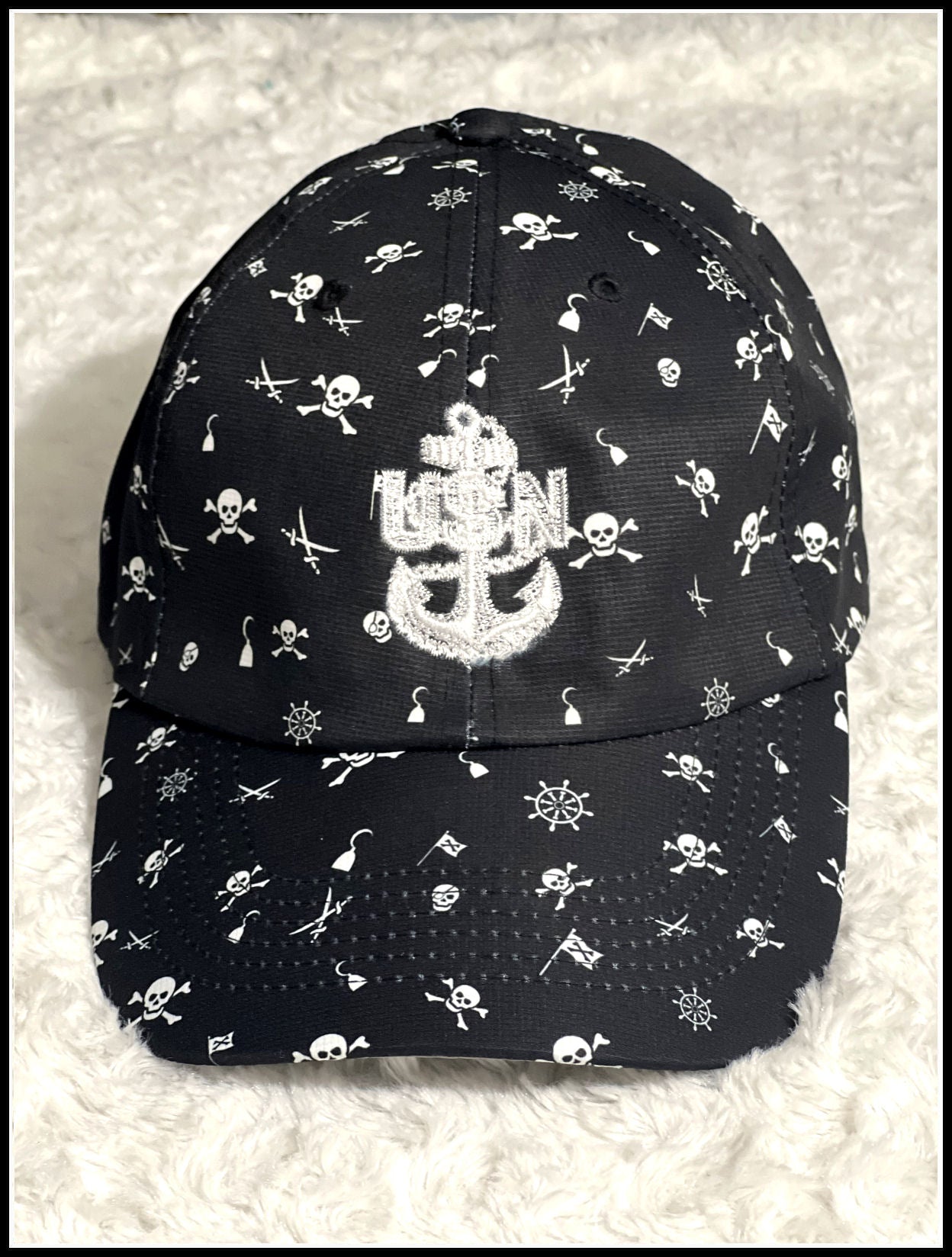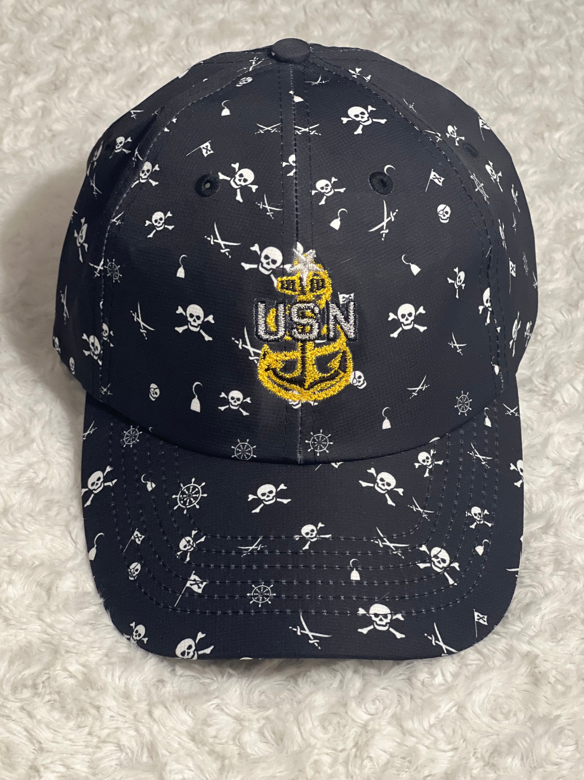Black Hat with white Pirate Themed Print Embroidered with your choice of White, Black or Golden Yellow Thread USN Anchor. Optional “Retired” or “Chick Chief” Embroidery on the back of the hat. Hats are adjustable, one size fits most.