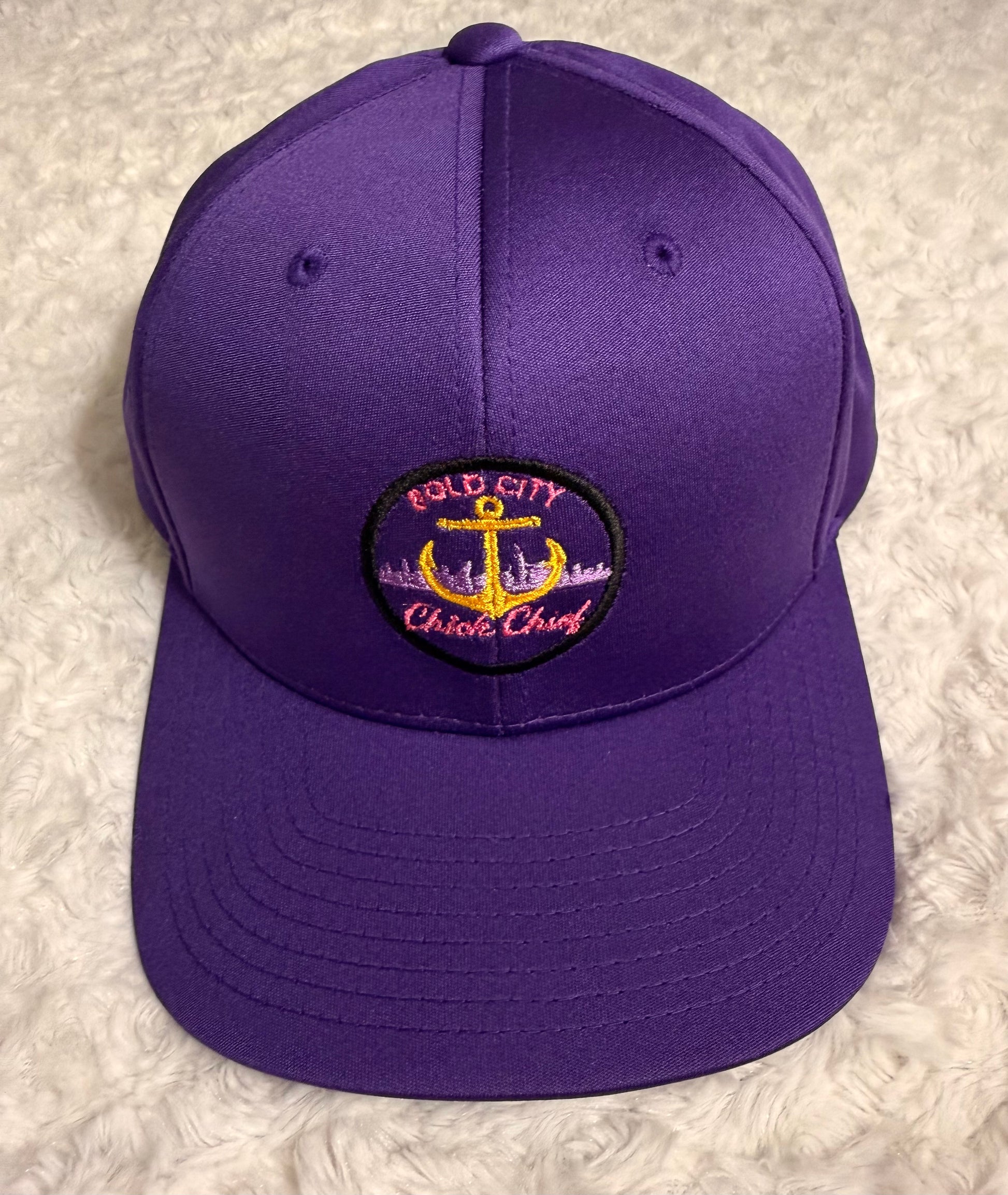 Purple Polyester hat with Bold City Chick Chief Design. Optional ”Chick Chief" or “Retired” Embroidered in Hot Pink on the back of the hat. SnapBack, one size fits most.