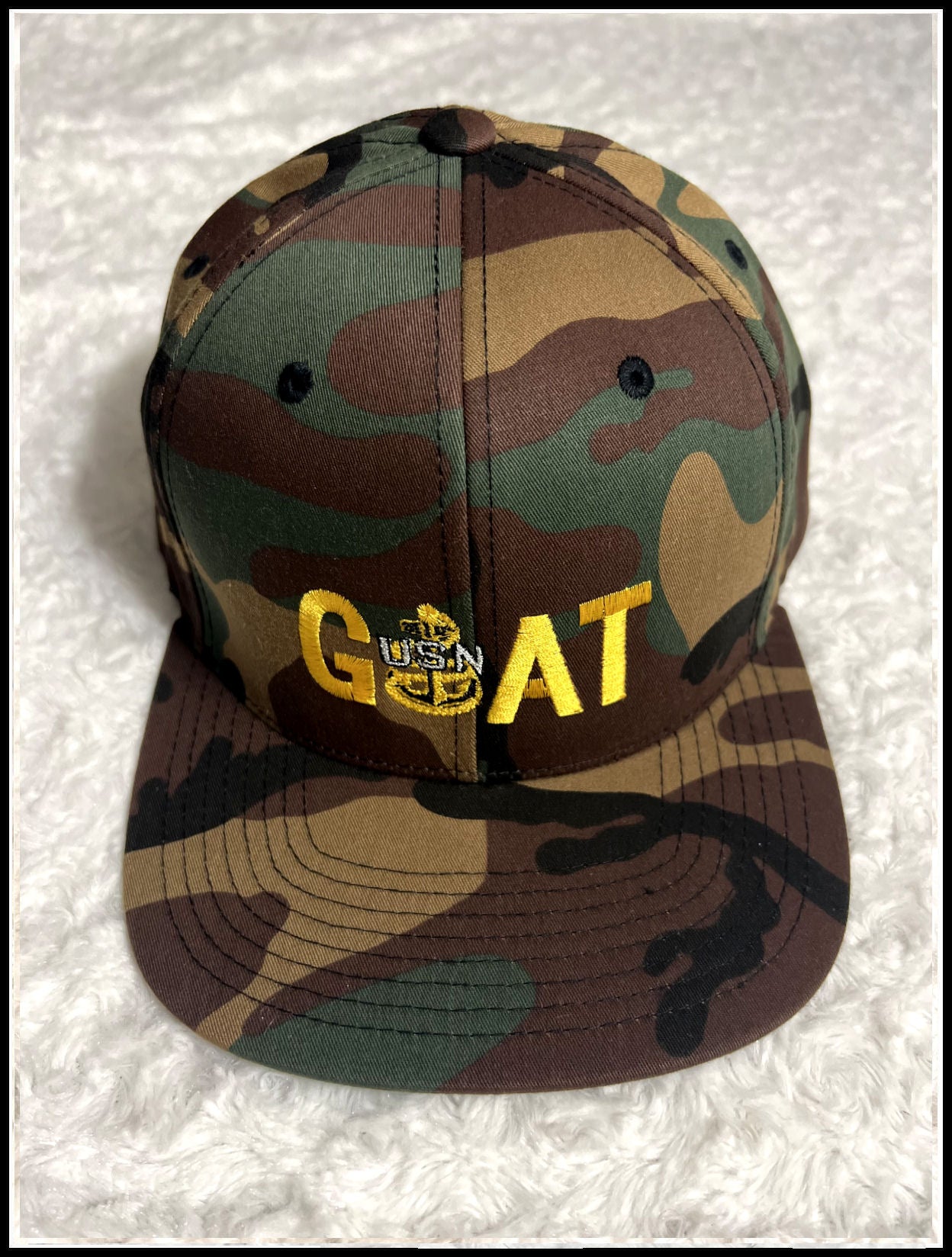 Camouflage SnapBack Flatbill hat with Embroidered Golden Yellow Thread GOAT design.