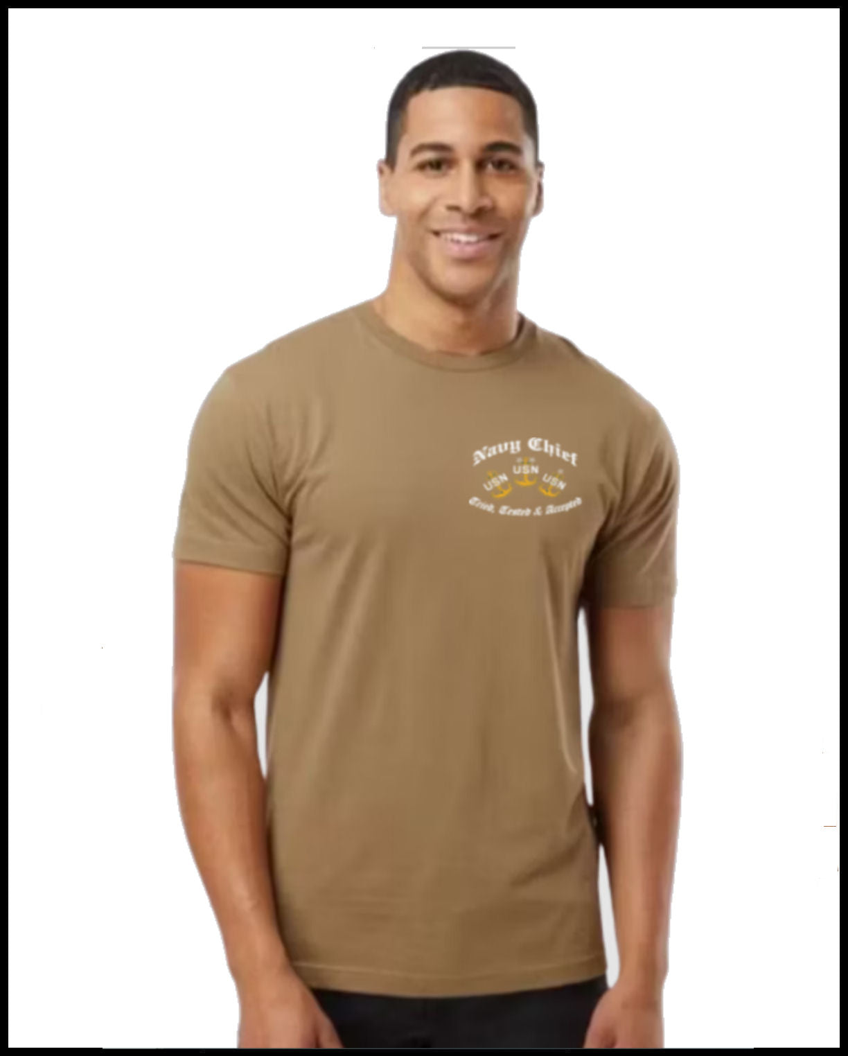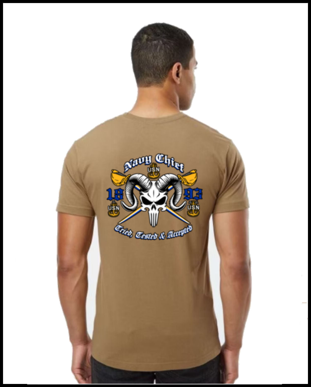 Coyote Brown T-Shirt with White, Golden Yellow and Blue Design.