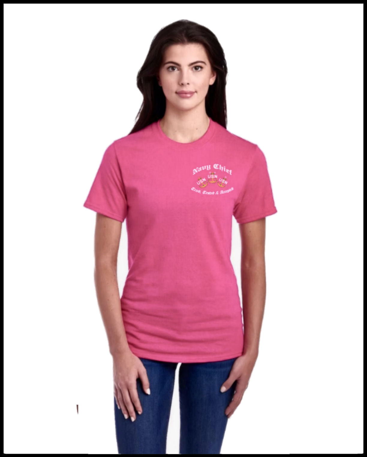 Hot Charity Pink T-Shirt with White, Golden Yellow and Blue Design.