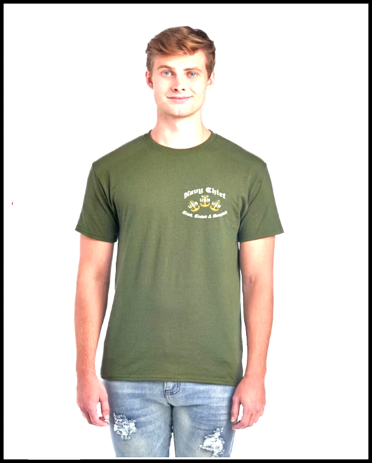 Unisex Cotton Crewneck Military Green T-Shirt with White, Gold & Blue Logo Design. Front & Back Shirt. 100% Cotton.