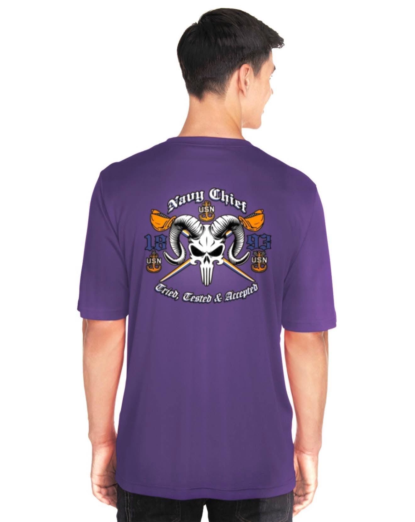 Unisex Crewneck Purole T-Shirt with White, Gold & Blue Logo Design. Front & Back Shirt. 100% Cotton.