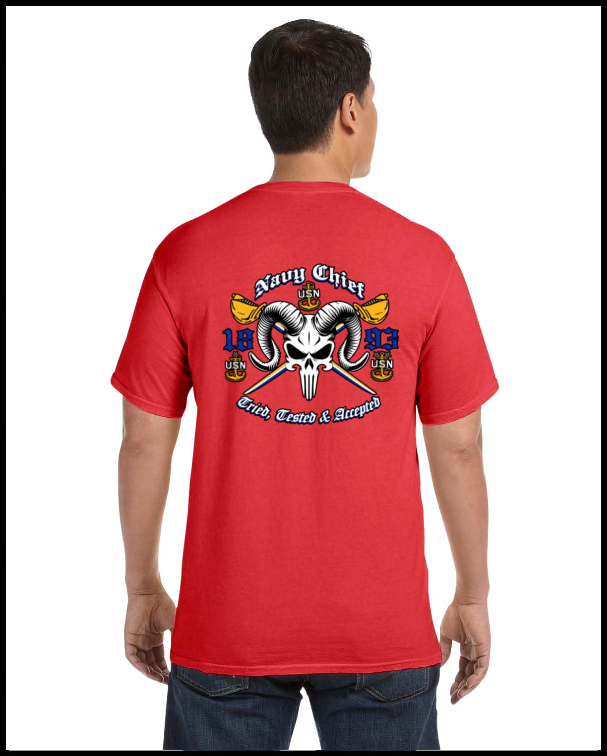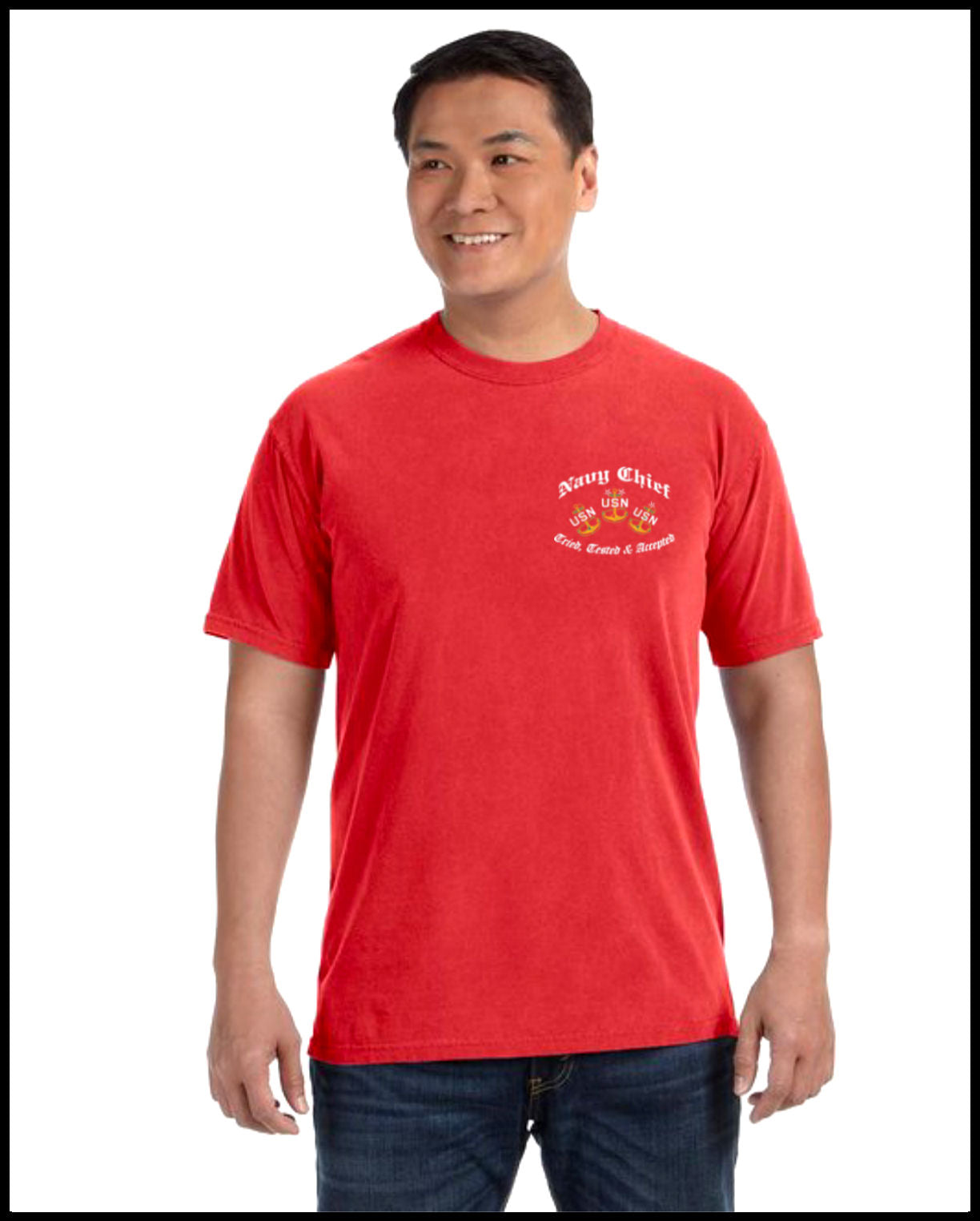 Red T-Shirt with White, Golden Yellow and Blue Design.