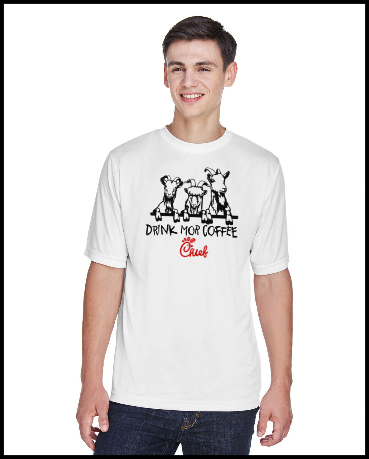 White Crewneck T-Shirt with Black and Red Design. 100% Cotton