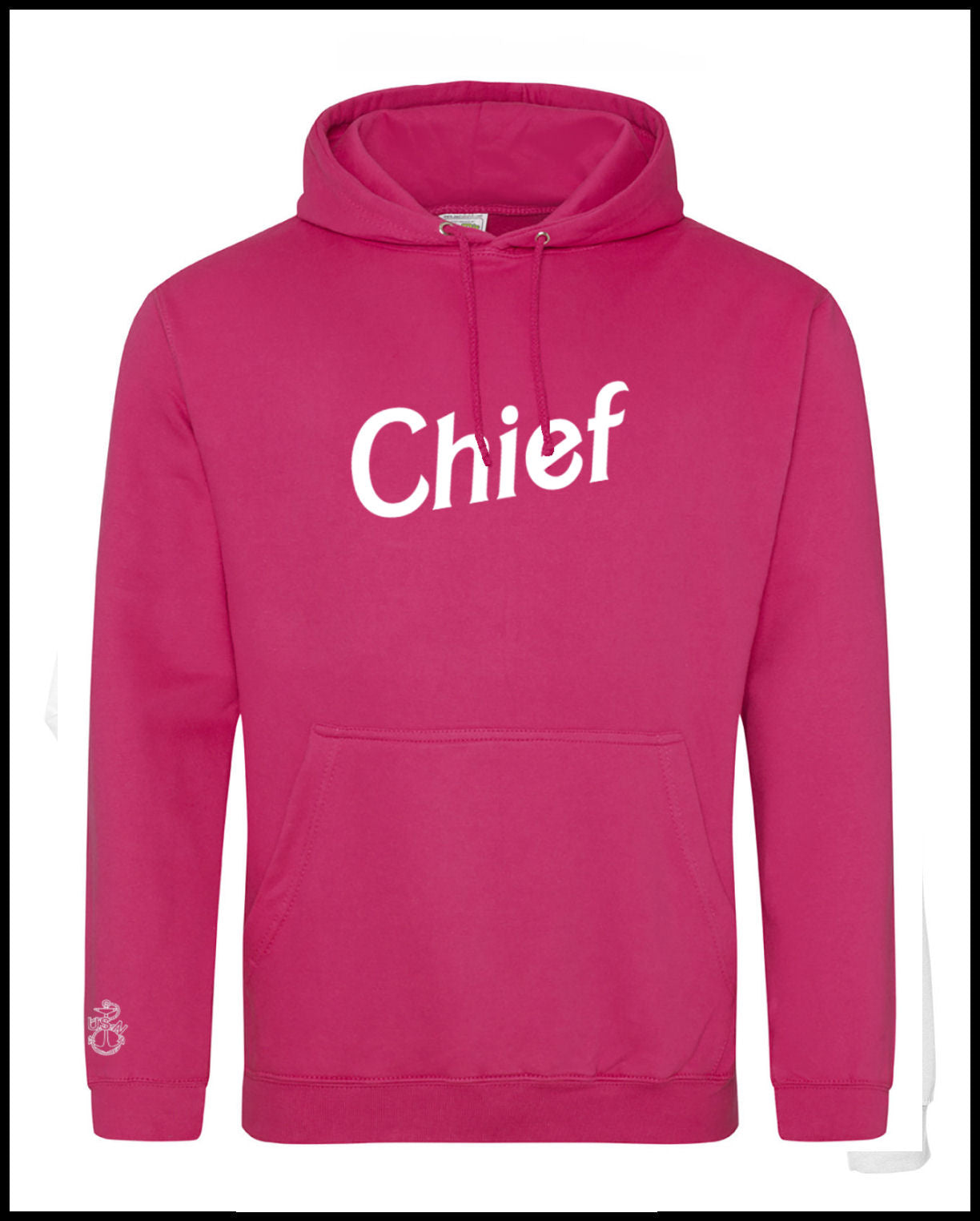 Hot Pink Hooded Sweatshirt with White Logo Design. Optional Heritage Anchor on sleeve.