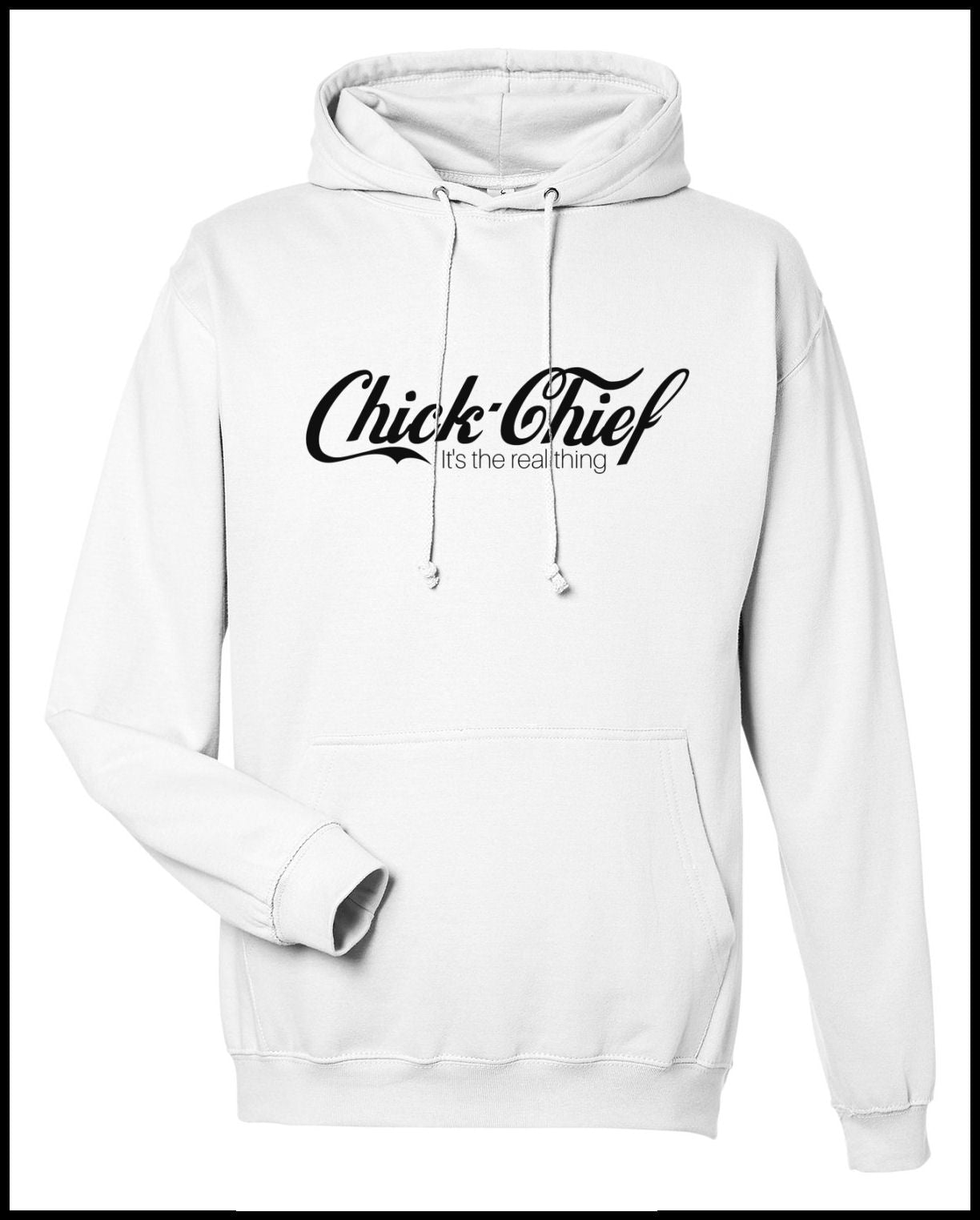 White Hooded Sweatshirt with Black Logo Design. Optional Heritage Anchor on sleeve.