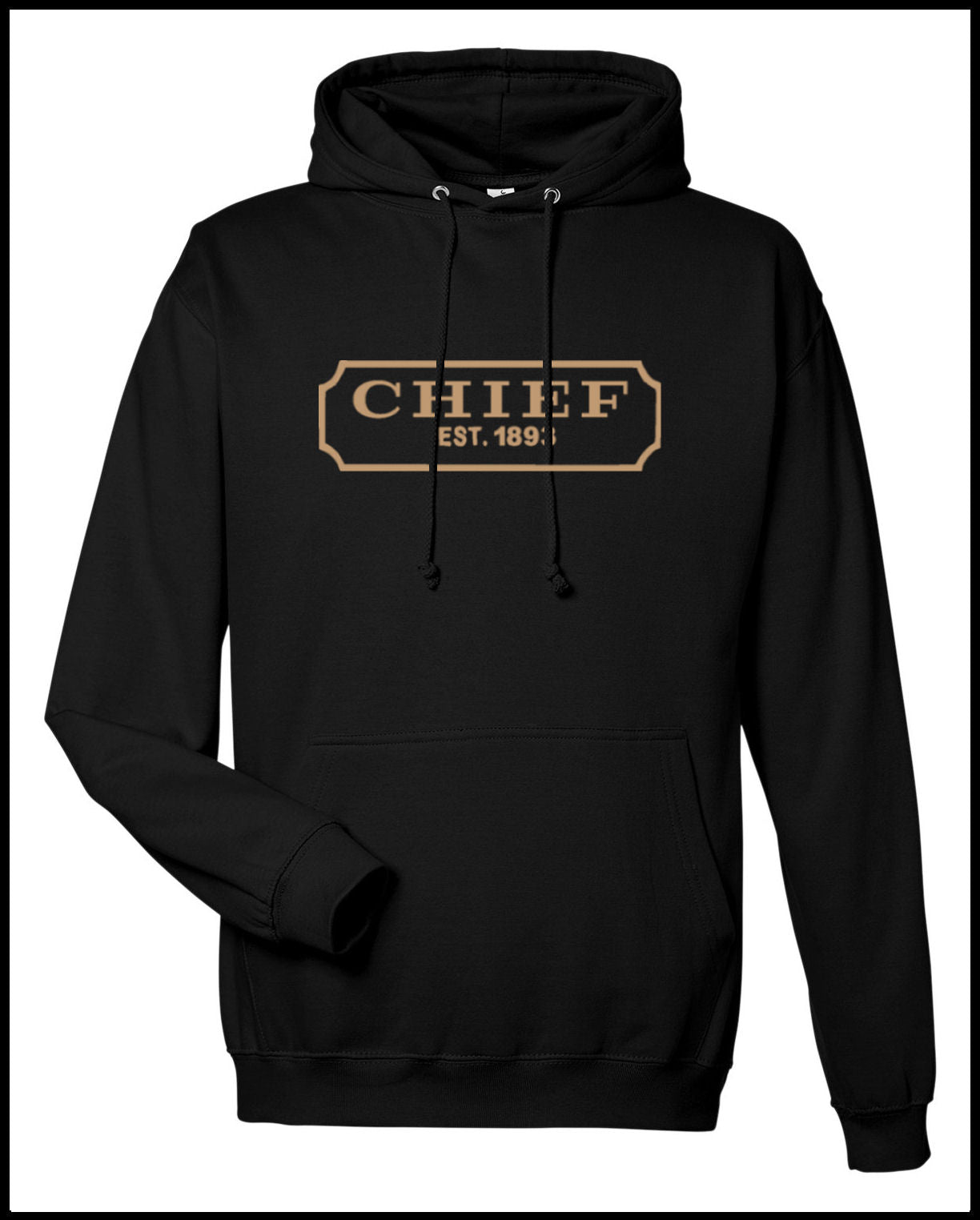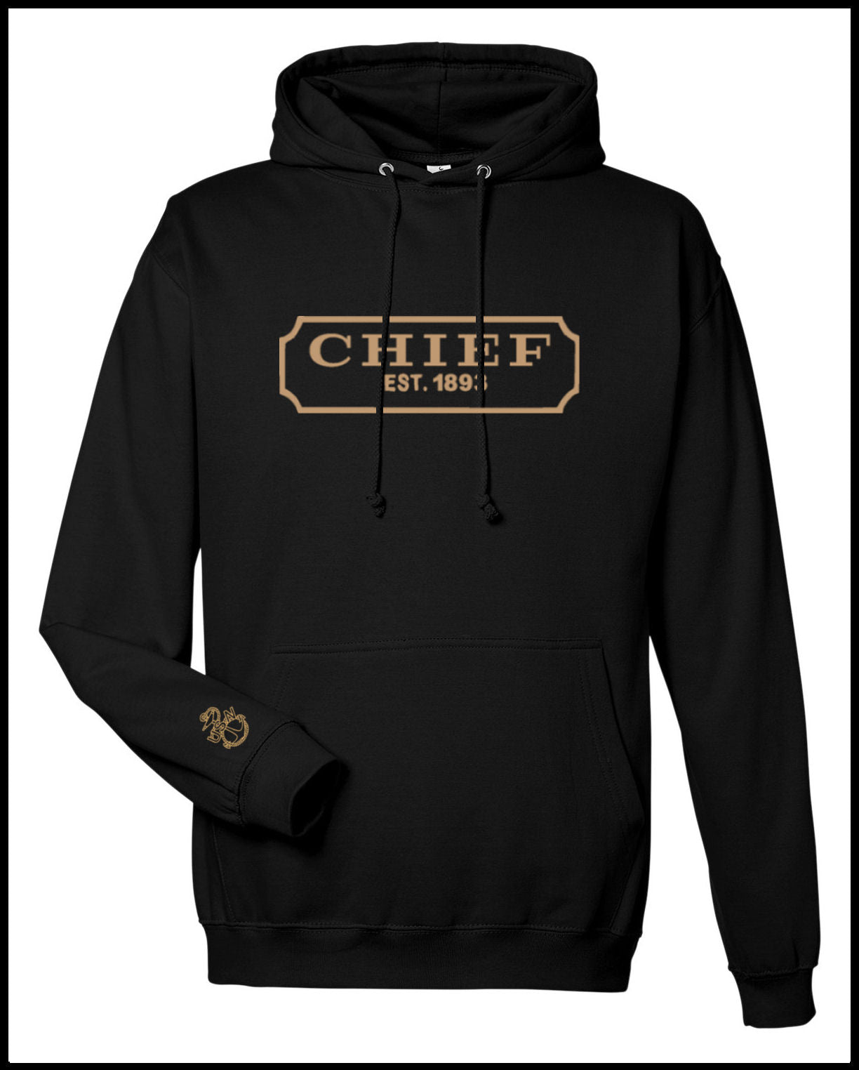 Black Hooded Sweatshirt with Khaki Logo Design. Optional Heritage Anchor on sleeve.
