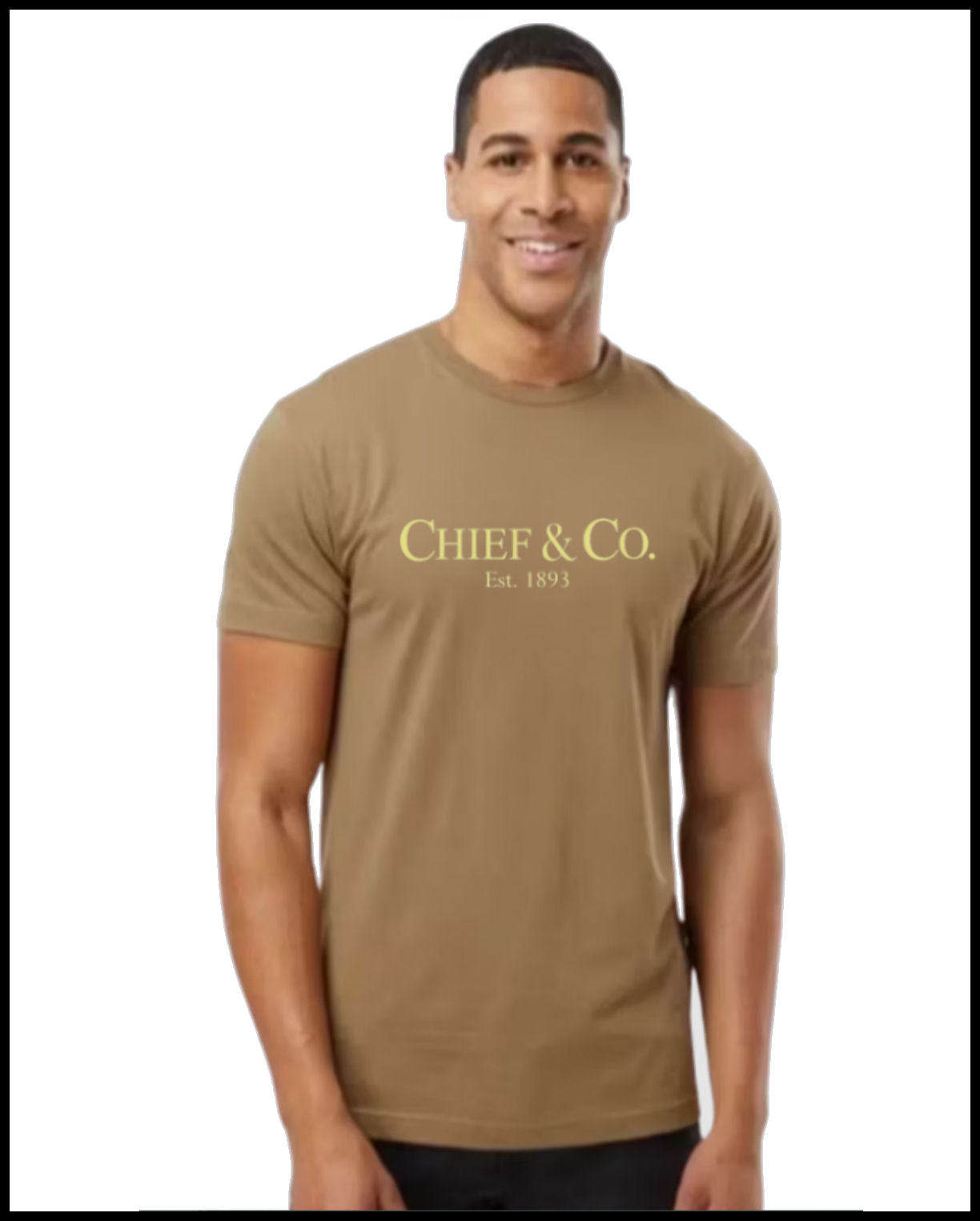 Chief & Company Crewneck Coyote Brown T-Shirt with Cream Logo. 100% Cotton