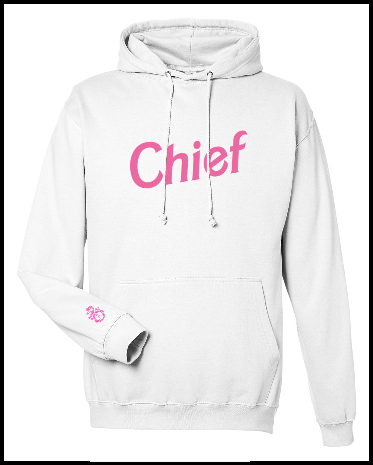 White Hooded Sweatshirt with Hot Pink Logo Design. Optional Heritage Anchor on sleeve.