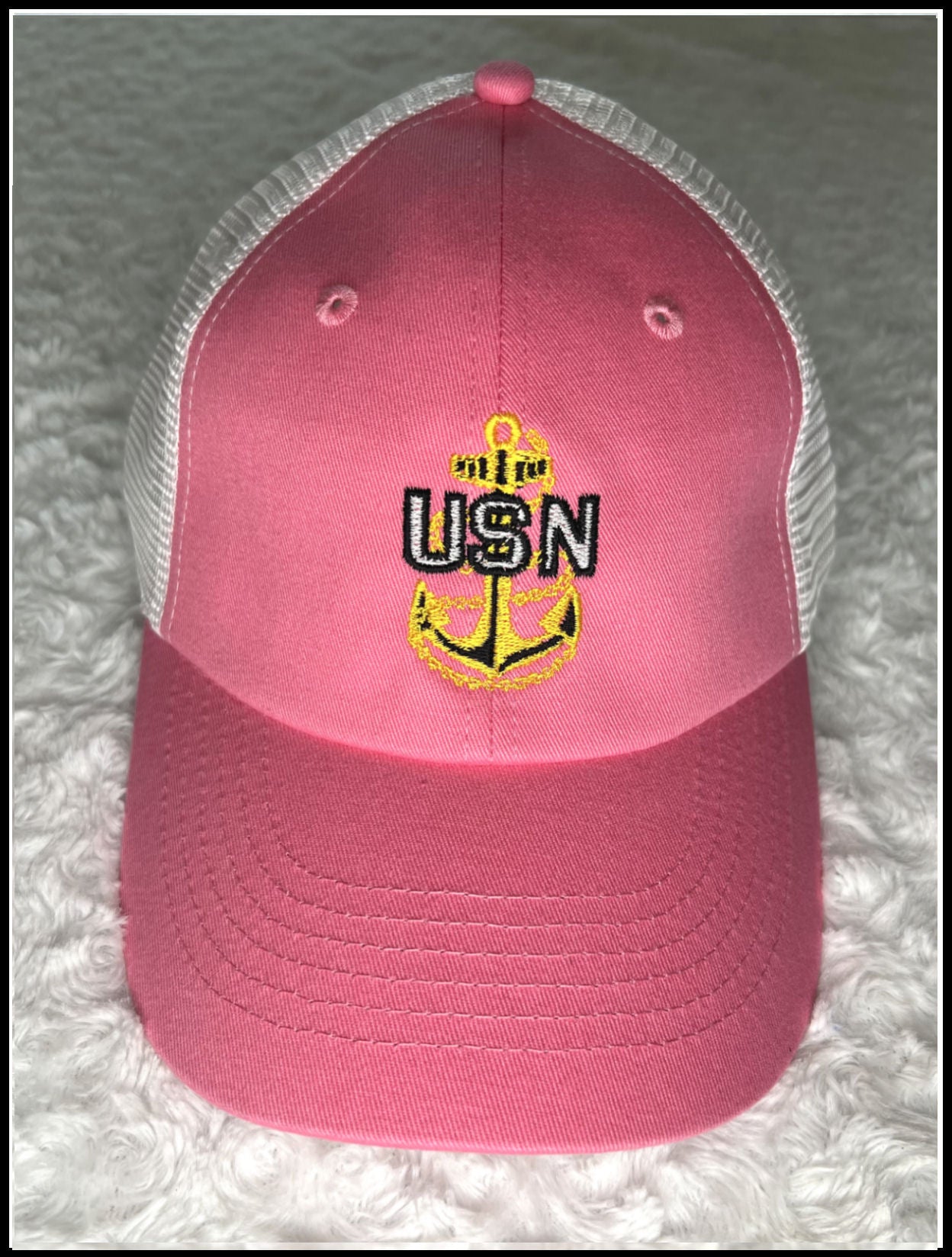 Pink & white Trucker hat with Gold Thread USN Anchor.