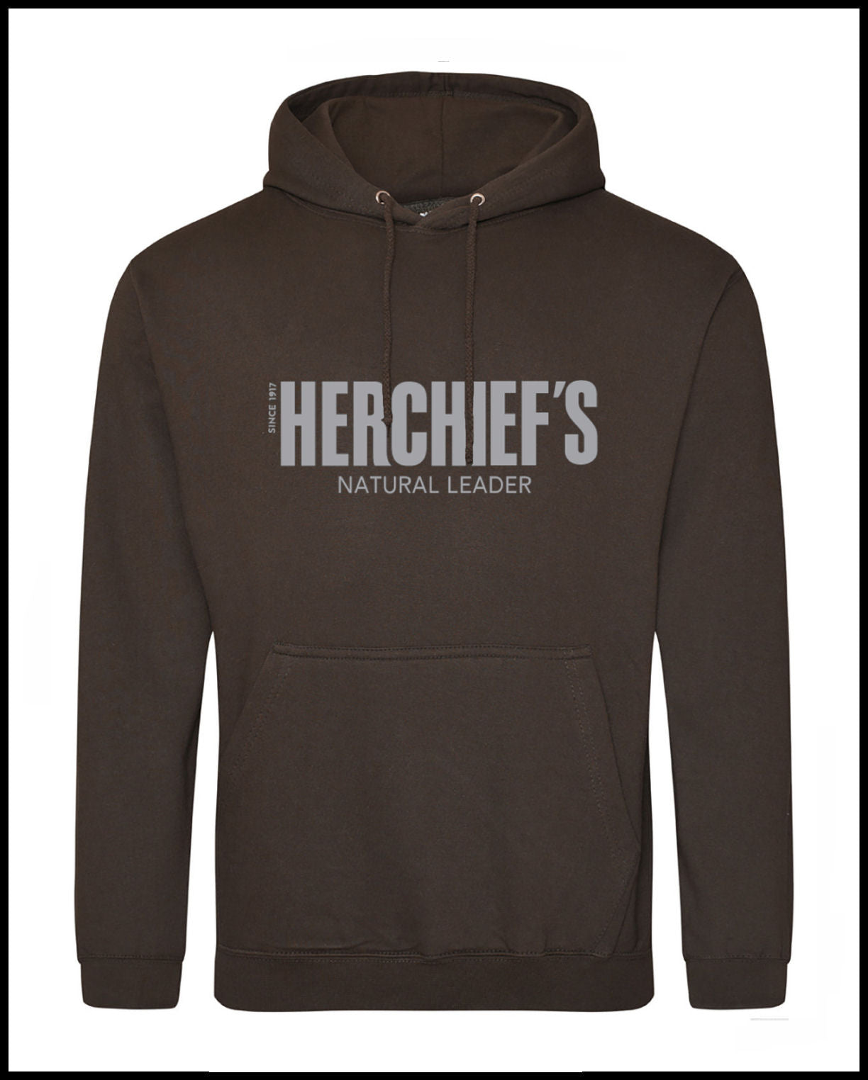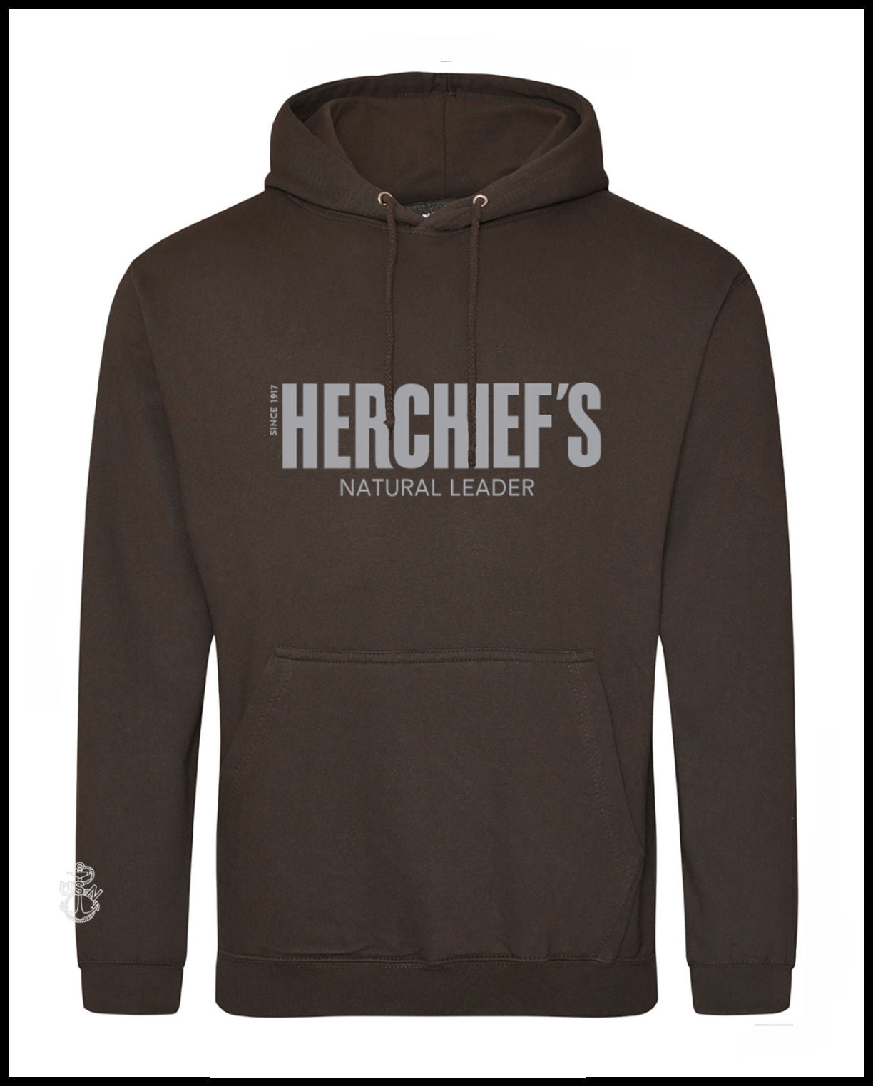Brown Hooded Sweatshirt with Gray Logo Design. Optional Heritage Anchor on sleeve.
