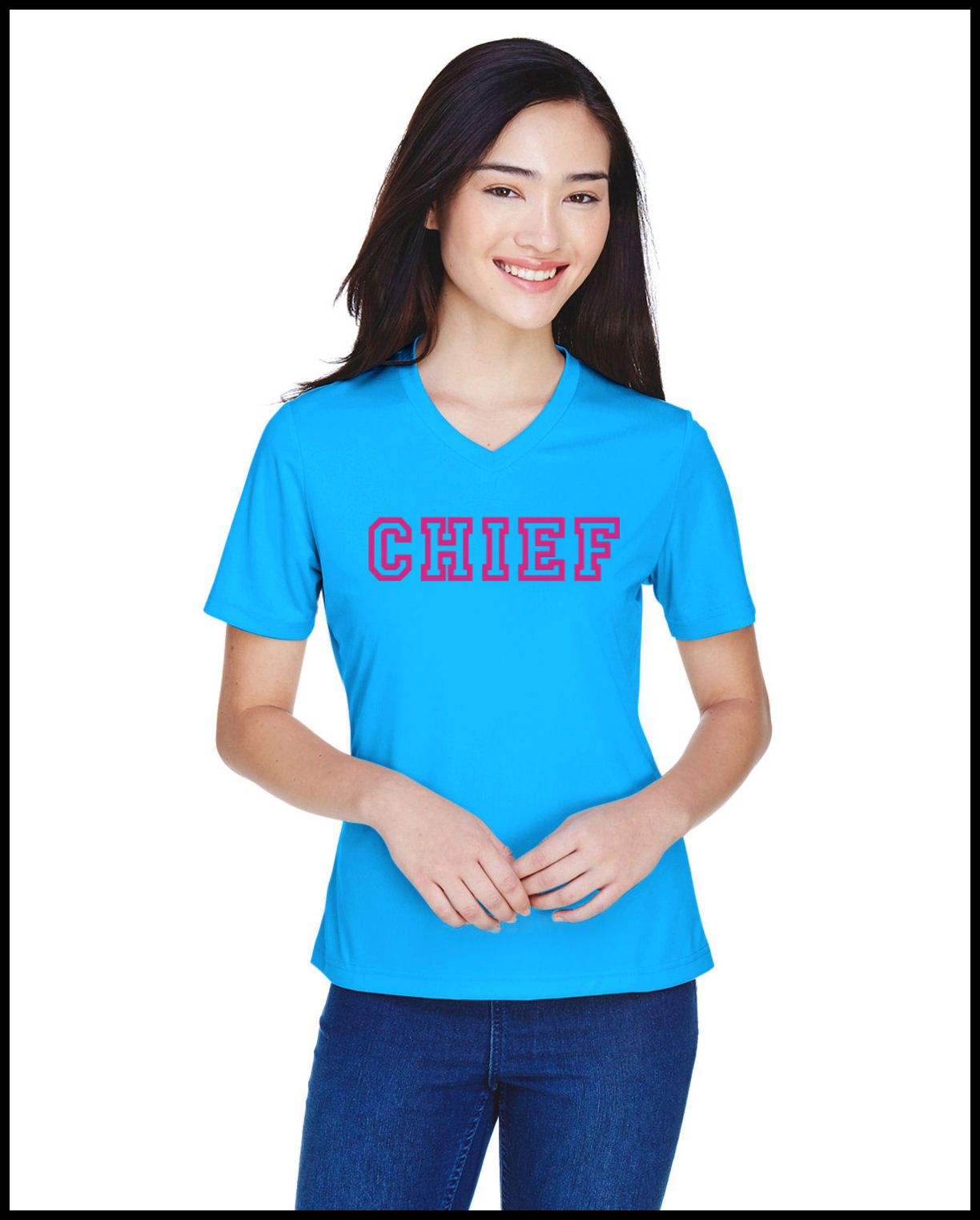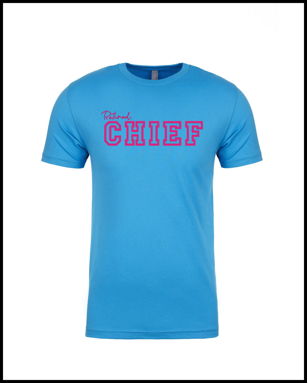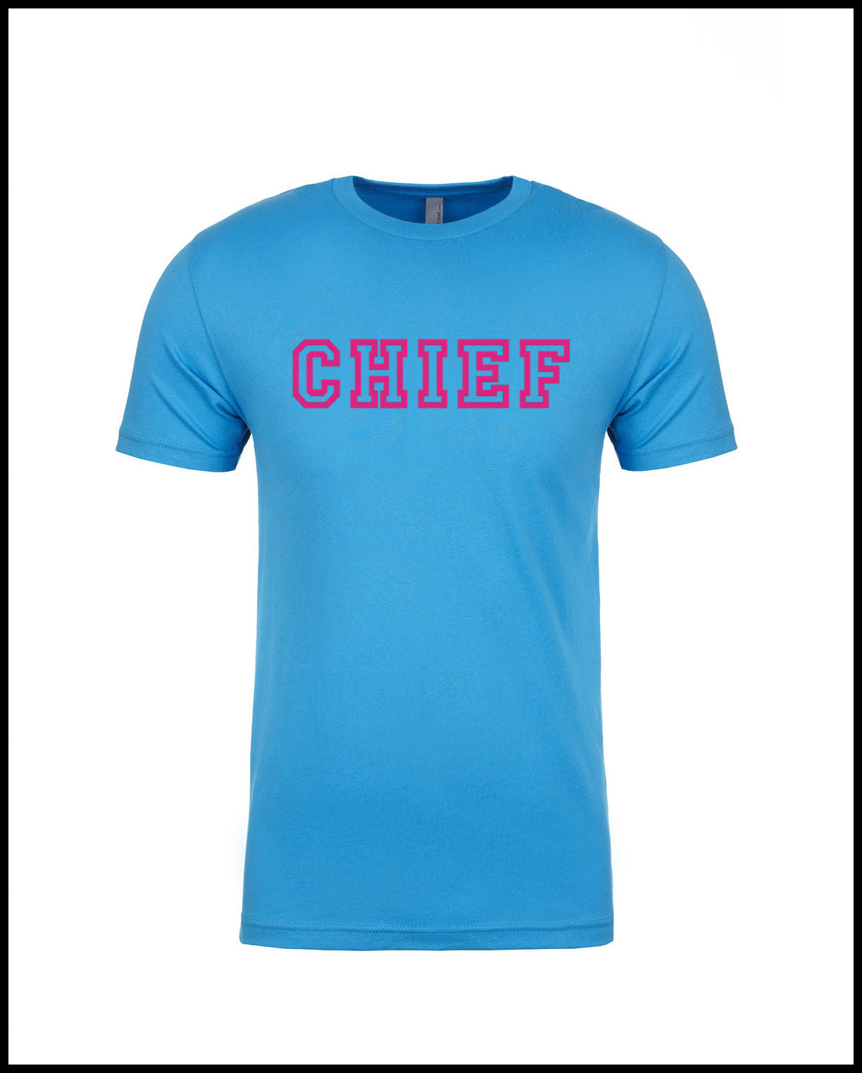 Turquoise Crewneck T-Shirt with Pink Chief Logo Design.