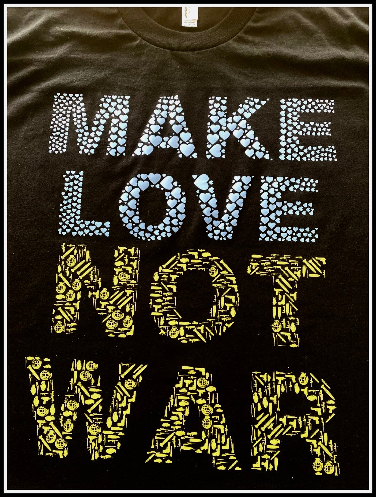 Black Crewneck T-Shirt with Light Blue, & Yellow Design. 100% cotton.