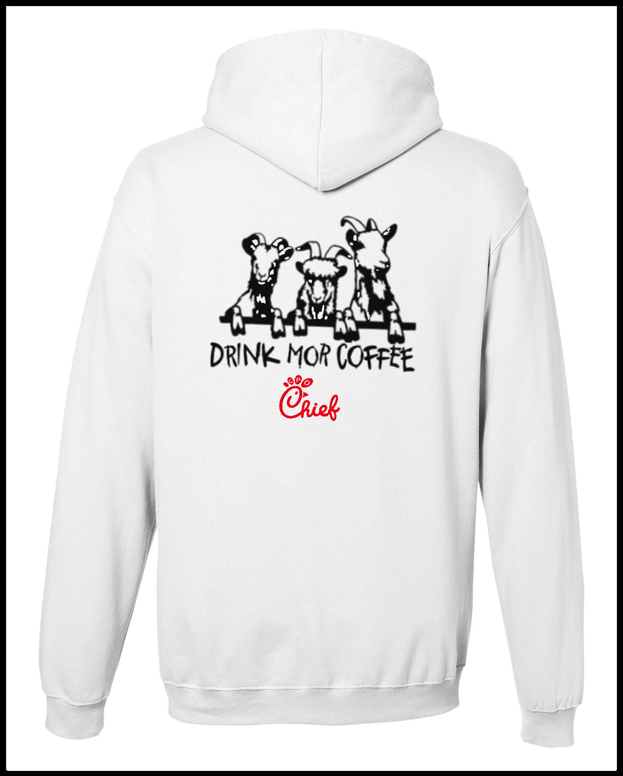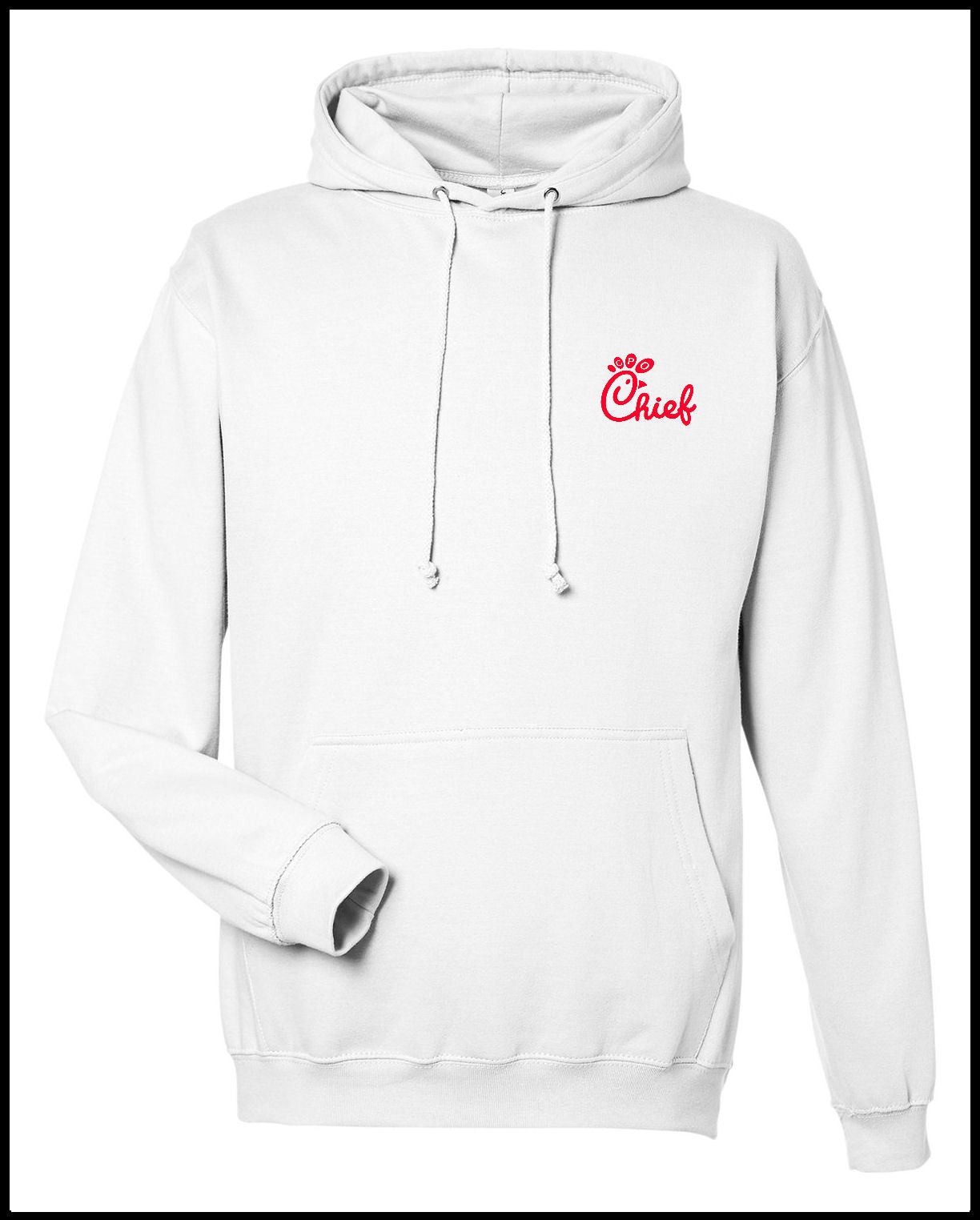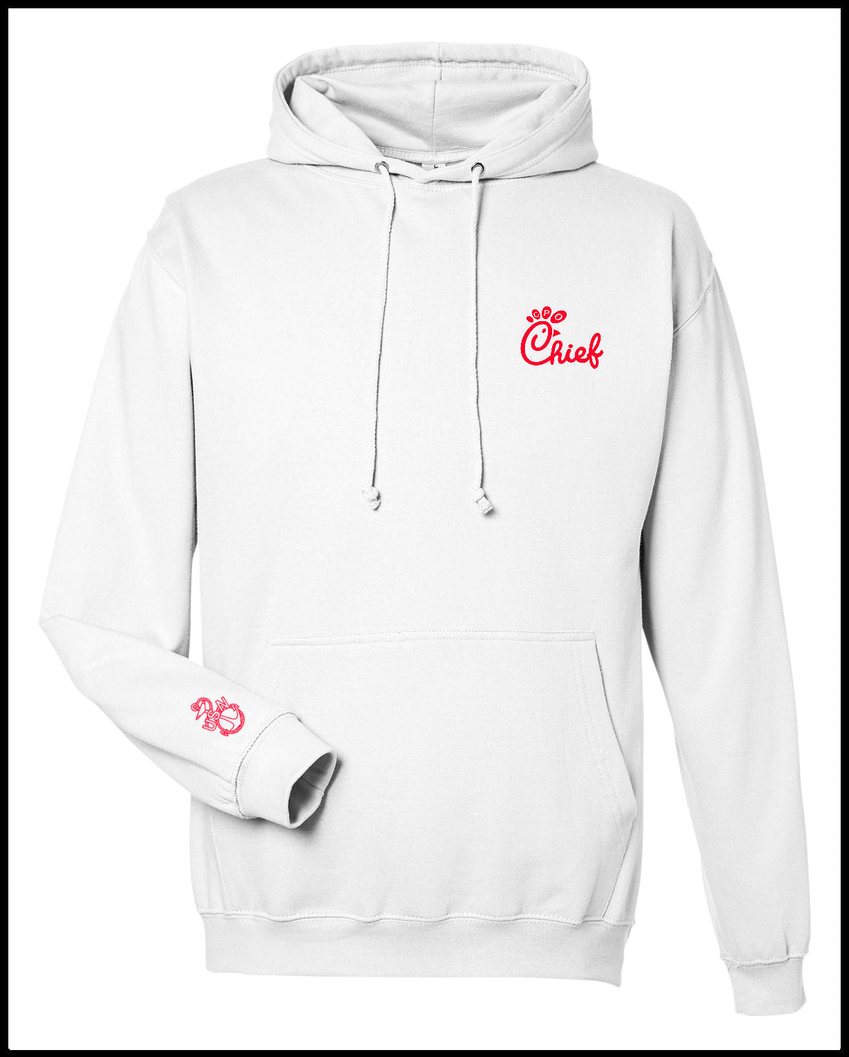 White Hooded Sweatshirt with Black & Red Logo Design. Optional Heritage Anchor on sleeve.