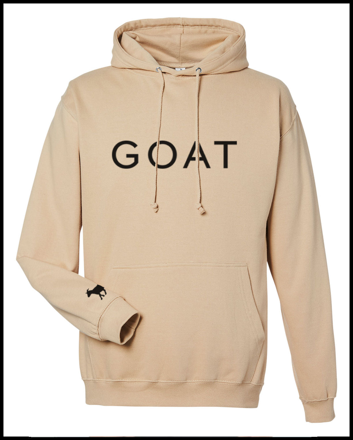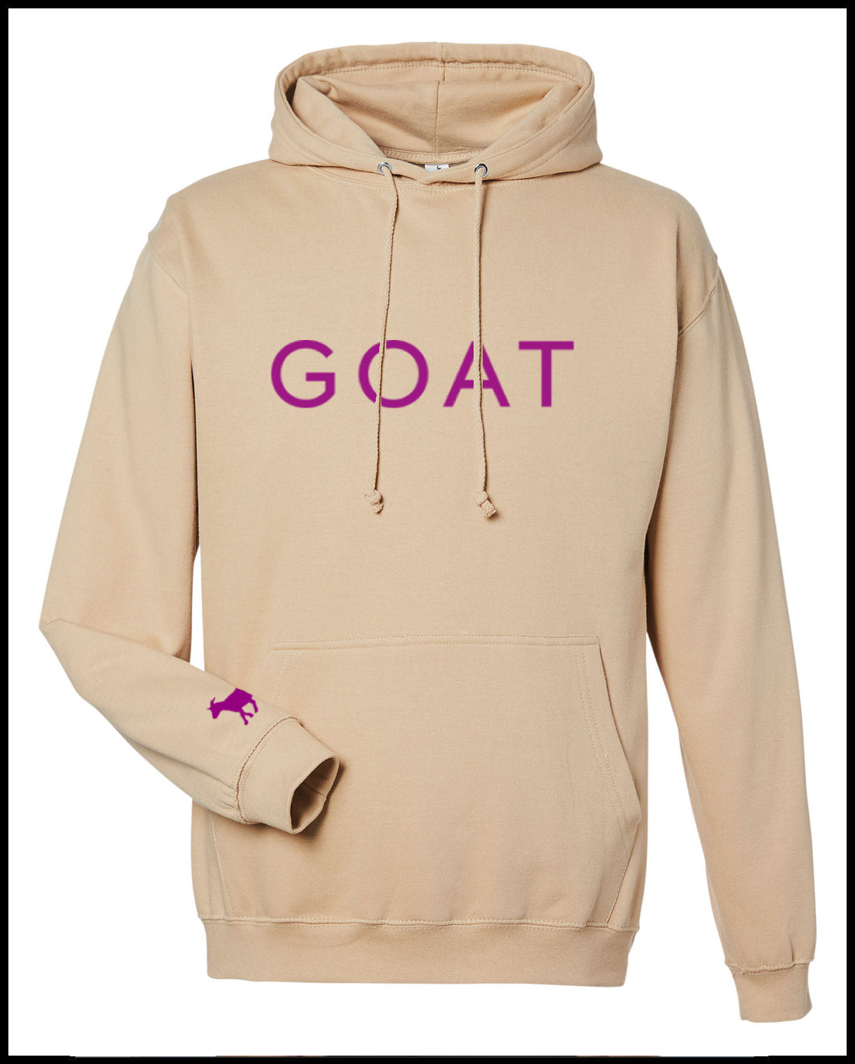 Tan Hooded Sweatshirt with choice of Black or Purple Logo Design. Goat on Sleeve.