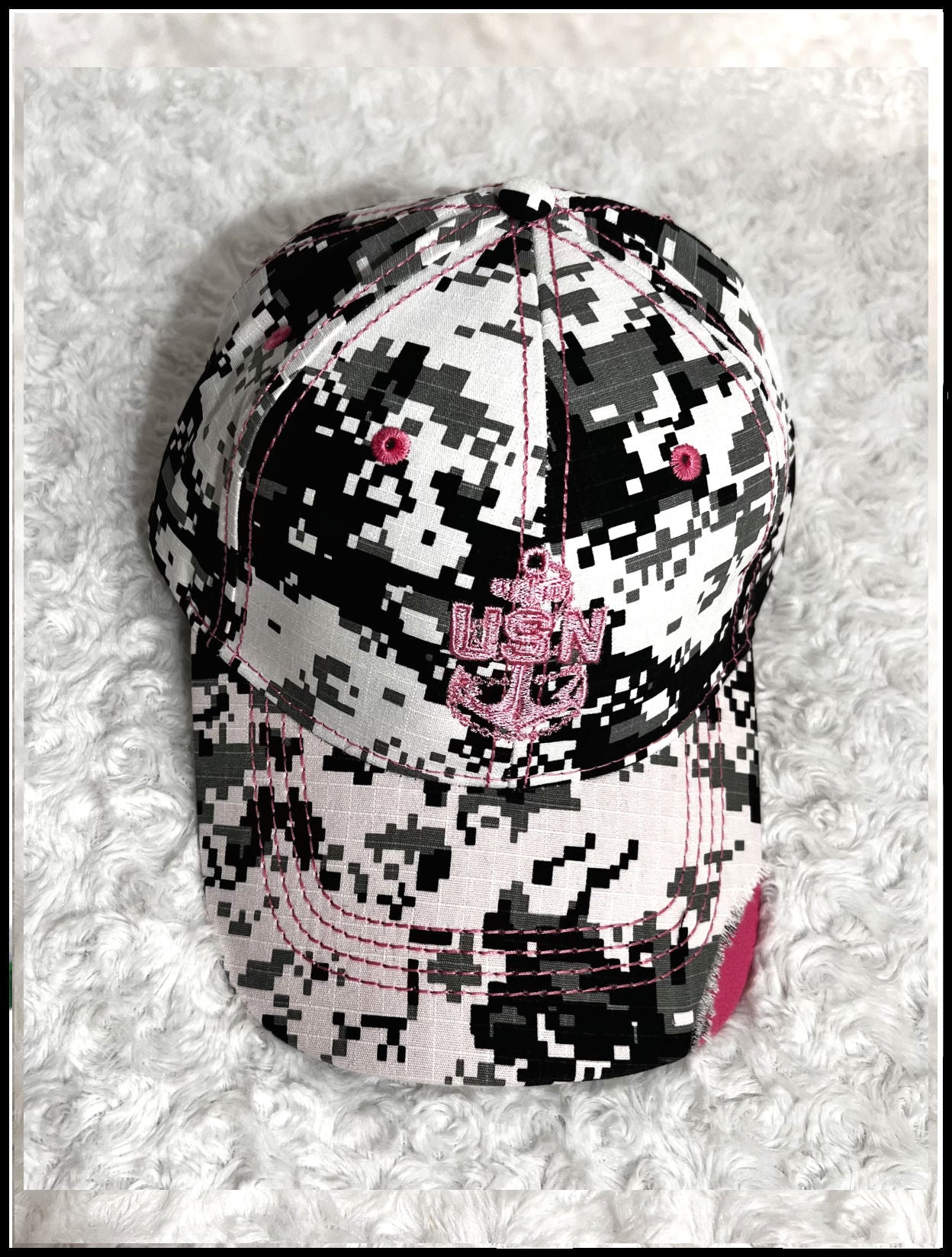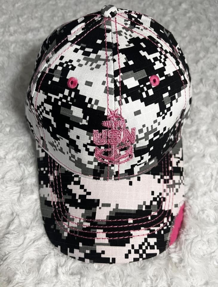 Snow Pink Digital Camo hat with Pink Thread USN Anchor. Hats are adjustable, one size fits most.