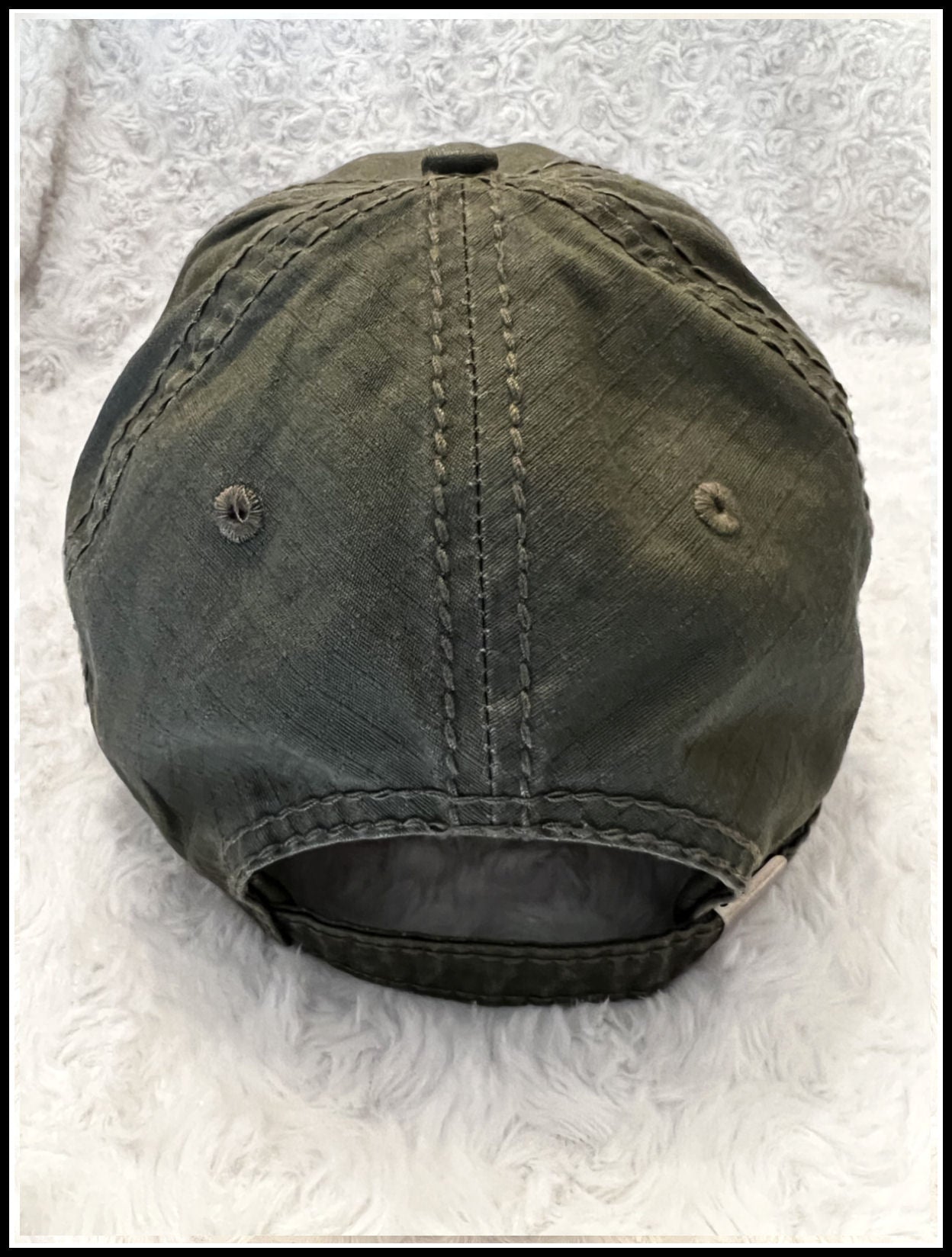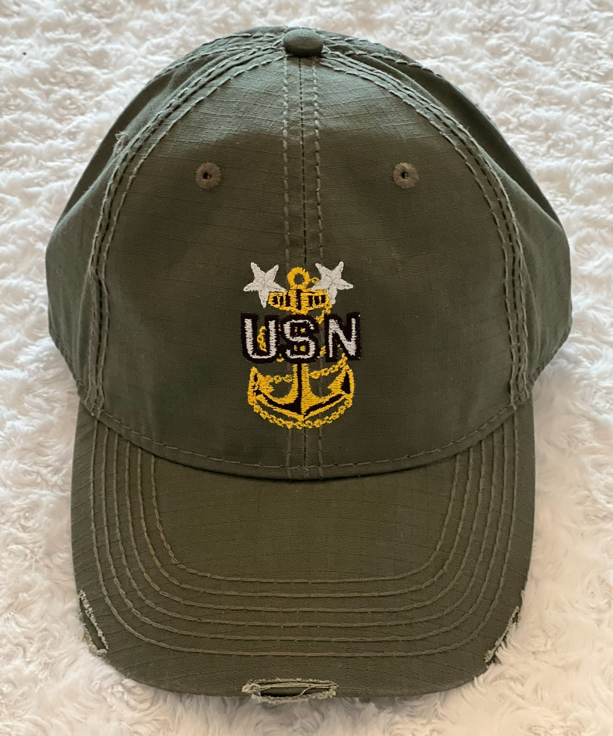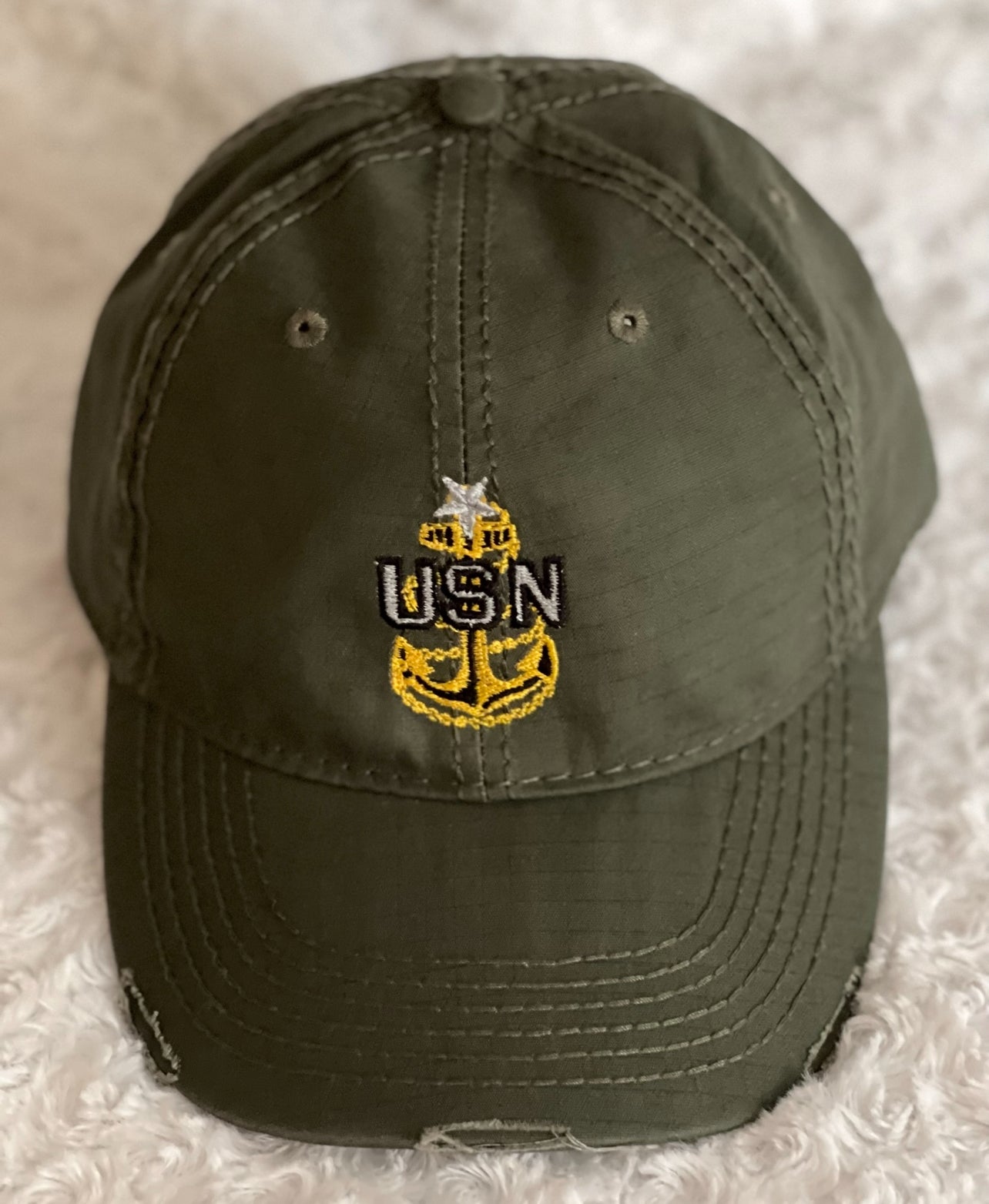 Military Green hat with Gold Thread USN Anchor. Optional “Chick Chief" or “Retired” Embroidery on the back of the hat. Hats are adjustable, one size fits all.