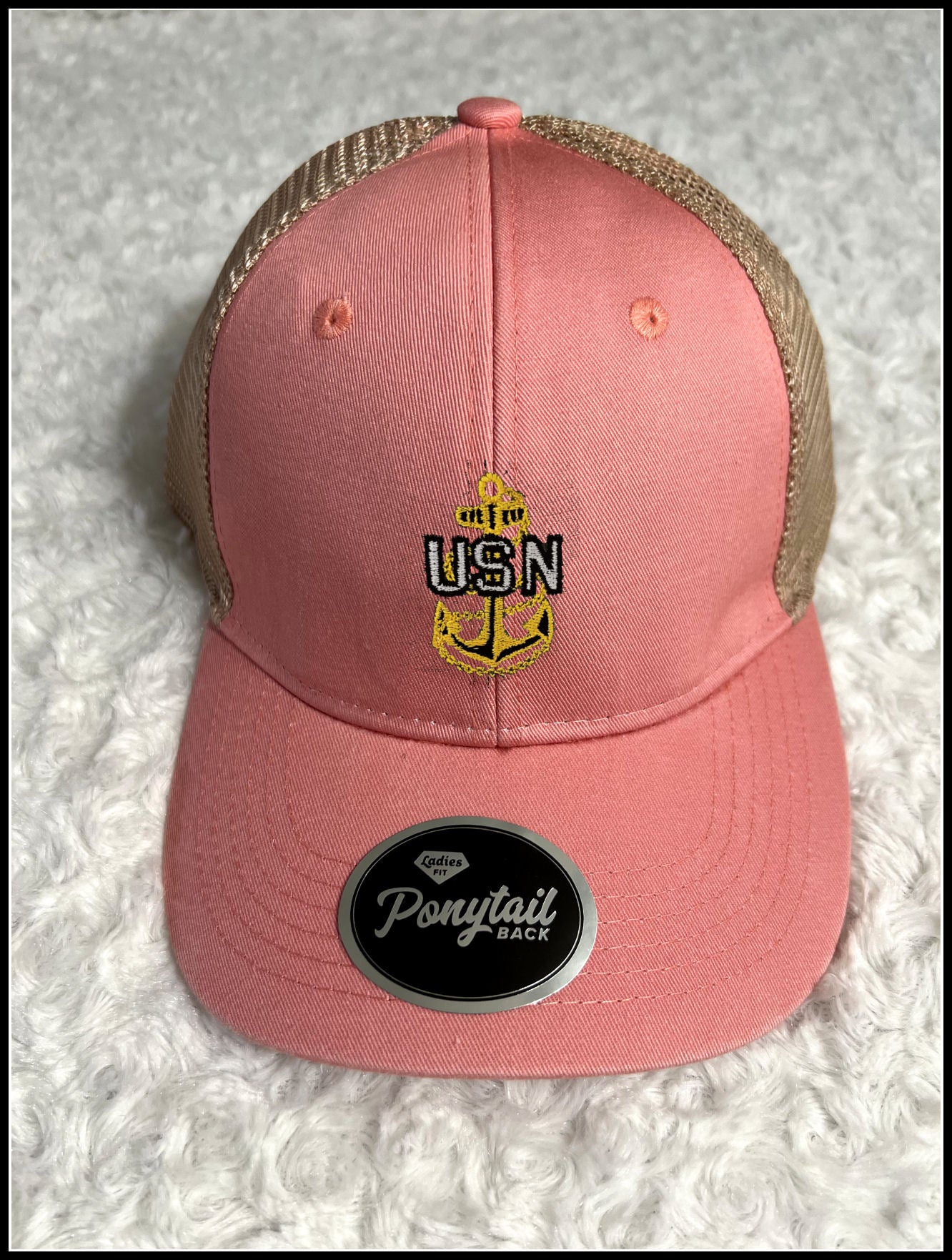 Light Coral Hat with Tan Trucker Backing with Ponytail opening wits Gold Embroidered CPO Anchor