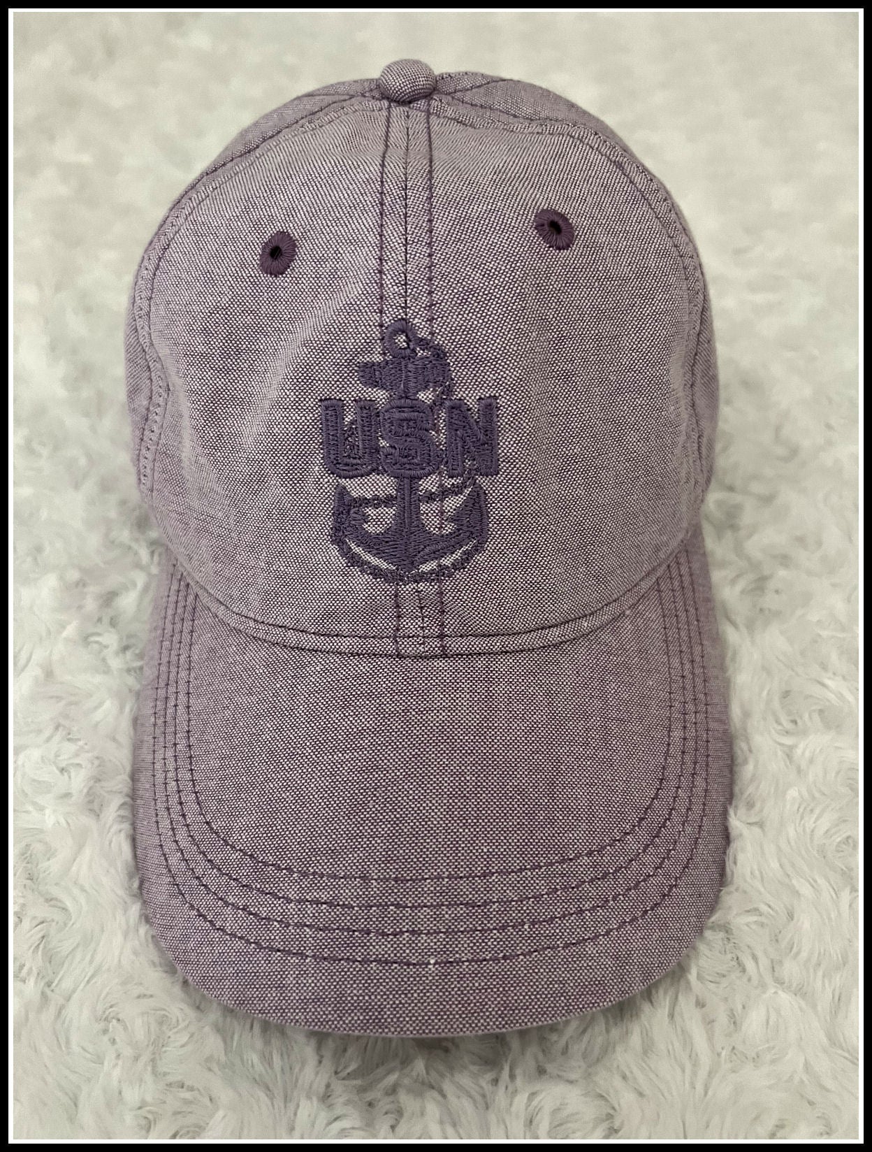 Light Purple hat with Purple Thread USN Anchor. Optional “Chick Chief" or “Retired” Embroidery on the back of the hat. Hats are adjustable, one size fits all.