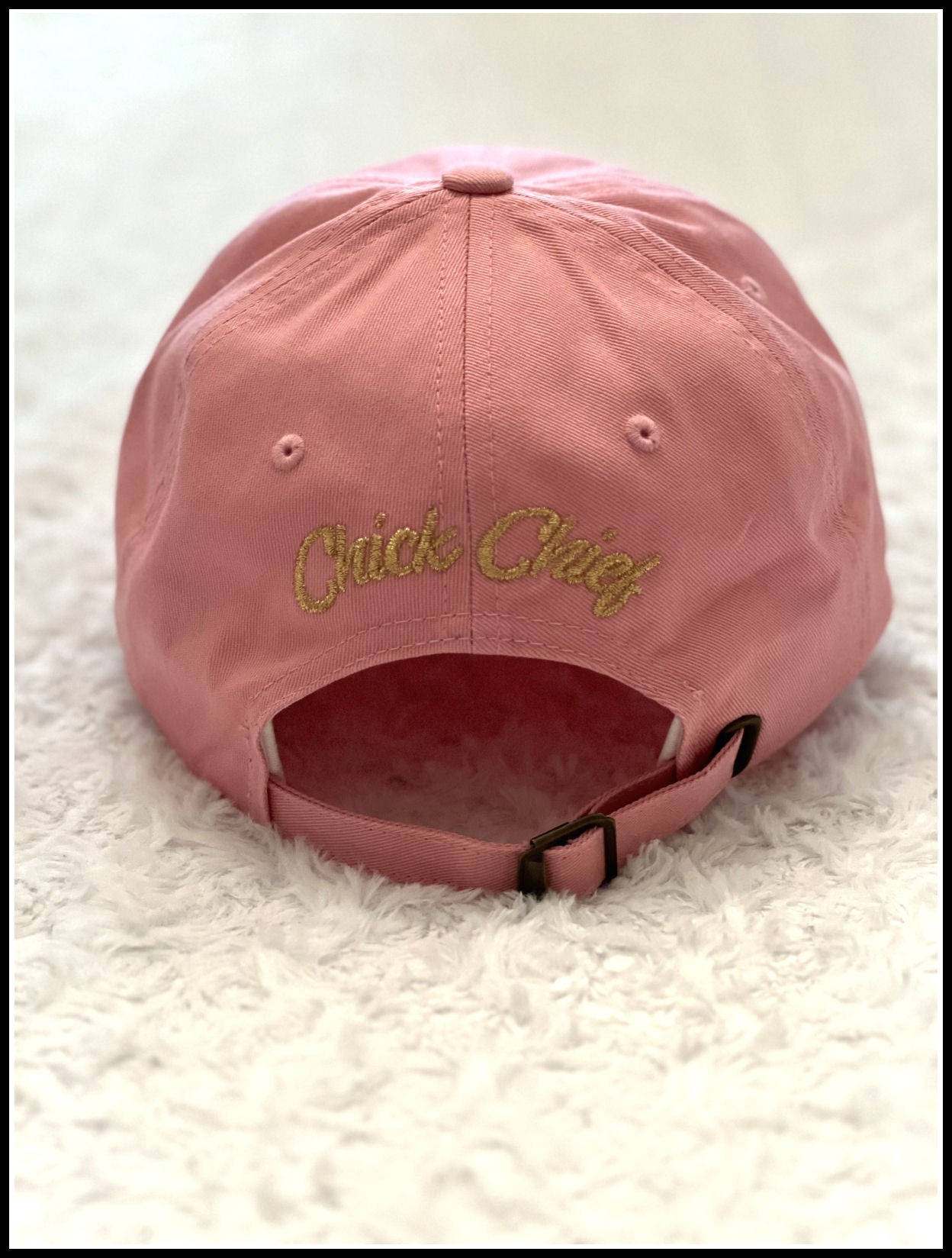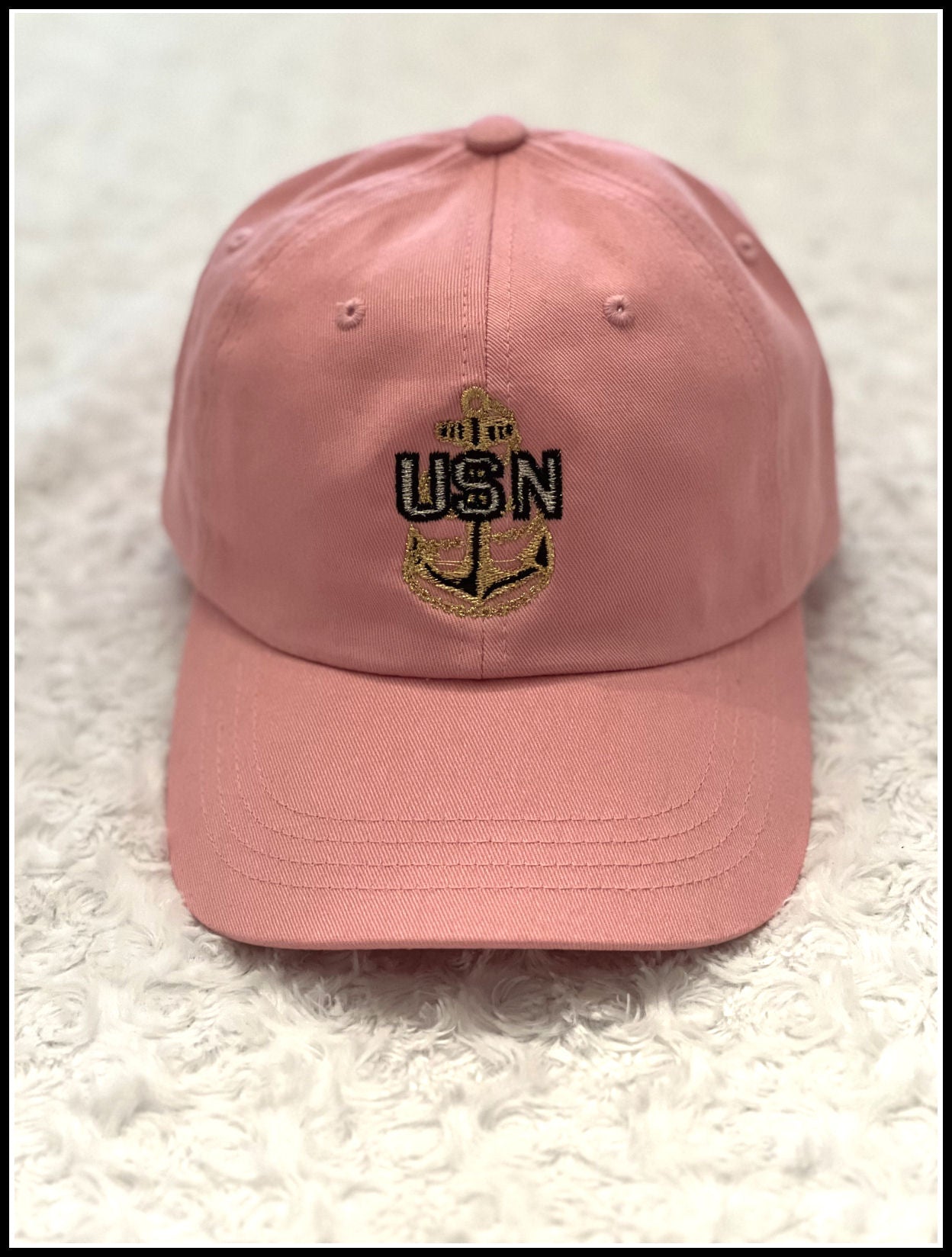 Pale Pink Cotton Twill hat with Gold Metallic Thread USN Anchor. Optional ”Chick Chief" or “Retired” Embroidery on the back of the hat.. Hats are adjustable, one size fits most.