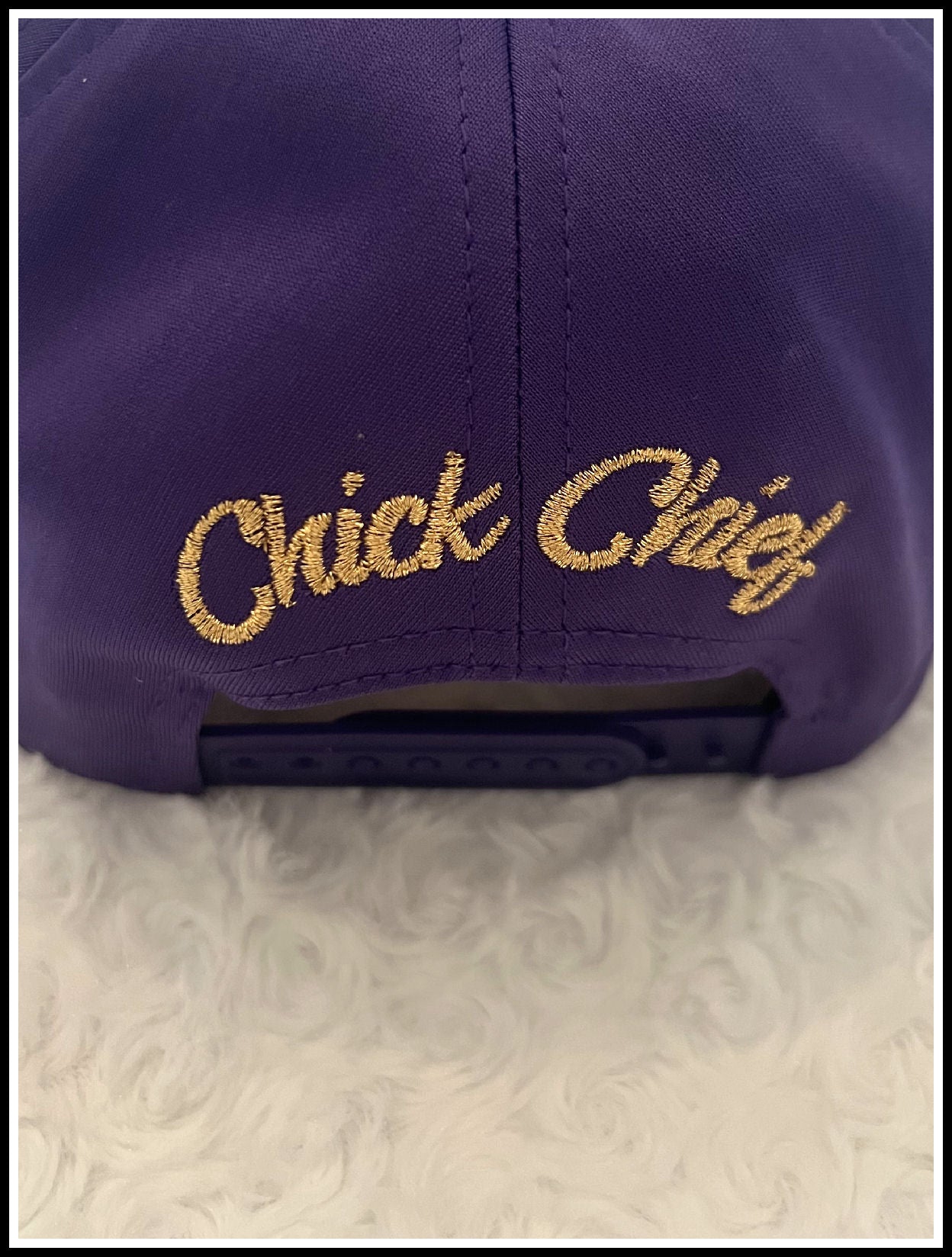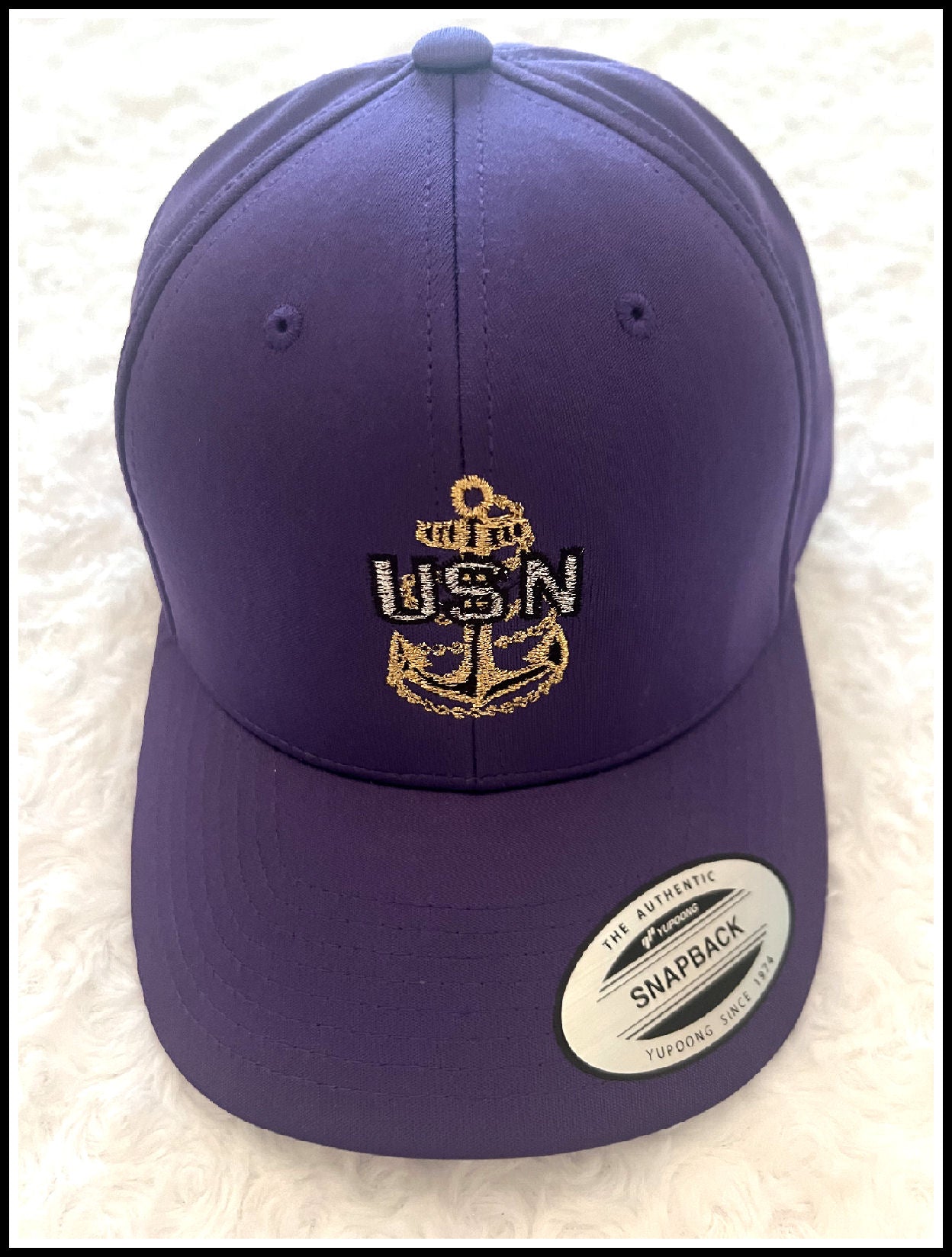 Purple hat with Gold Thread USN Anchor. Optional ”Chick Chief" or “Retired” Embroidered on the back of the hat. SnapBack, one size fits most.