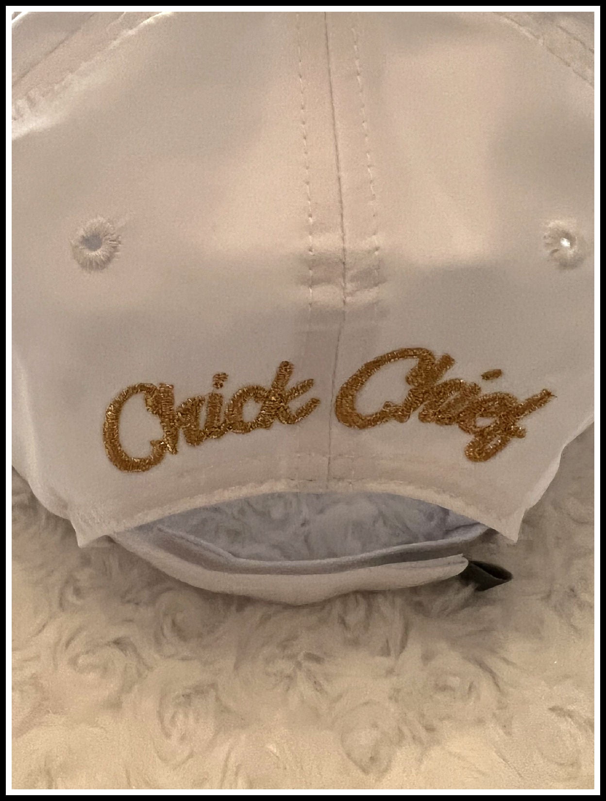 White Polyester hat with Gold Metallic Thread USN Anchor. Optional “Chick Chief" Embroidery on the back of the hat. Hats are adjustable, one size fits all.