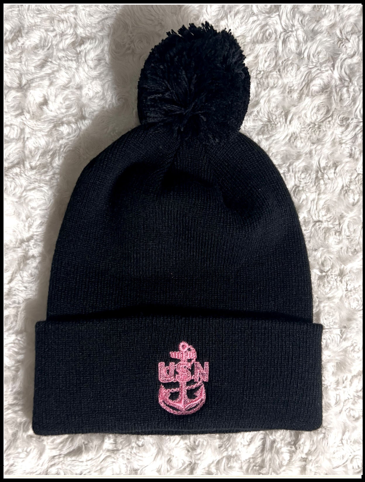 Black Pom-Pom Beanie with Pink Thread USN Anchor.
