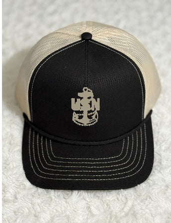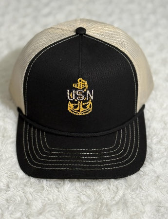 Black and Khaki Lariat Trucker Hat with USN Anchor with your choice of Gold, Khaki, or Black Thread