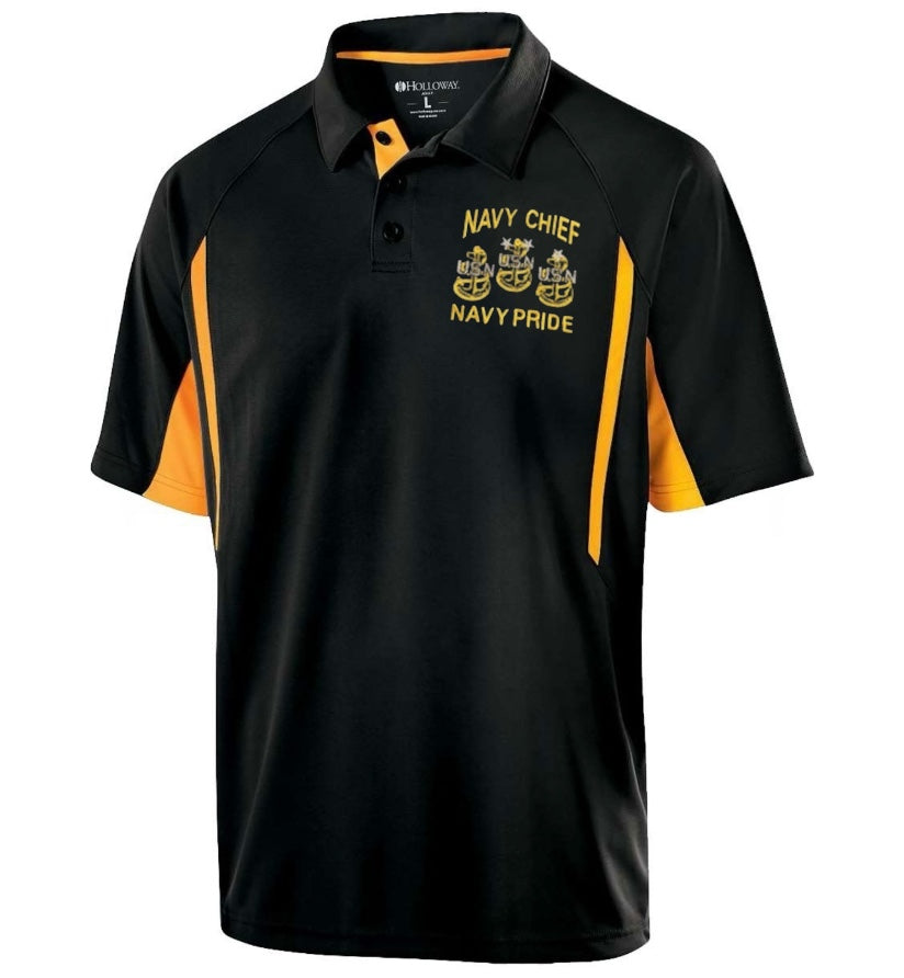 Two Toned Black and Golden Yellow Performance Polo shirt with Gold Navy Chief Navy Pride Embroidered Logo with all 3 Anchors.