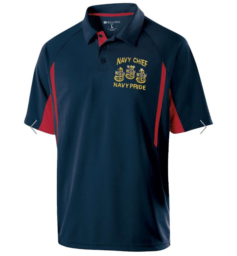 Two Toned Navy Blue and Red Performance Polo shirt with Gold Navy Chief Navy Pride Embroidered Logo with all 3 Anchors.