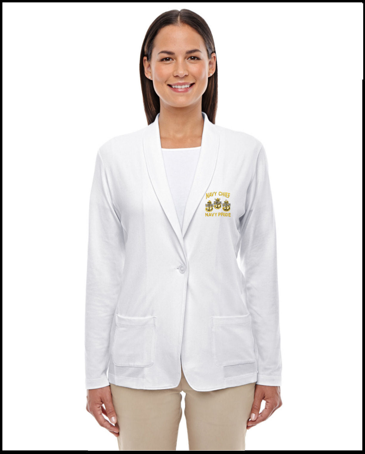 White Shawl Collar Cardigan with Gold Navy Chief Navy Pride Embroidered Logo with all 3 Anchors.