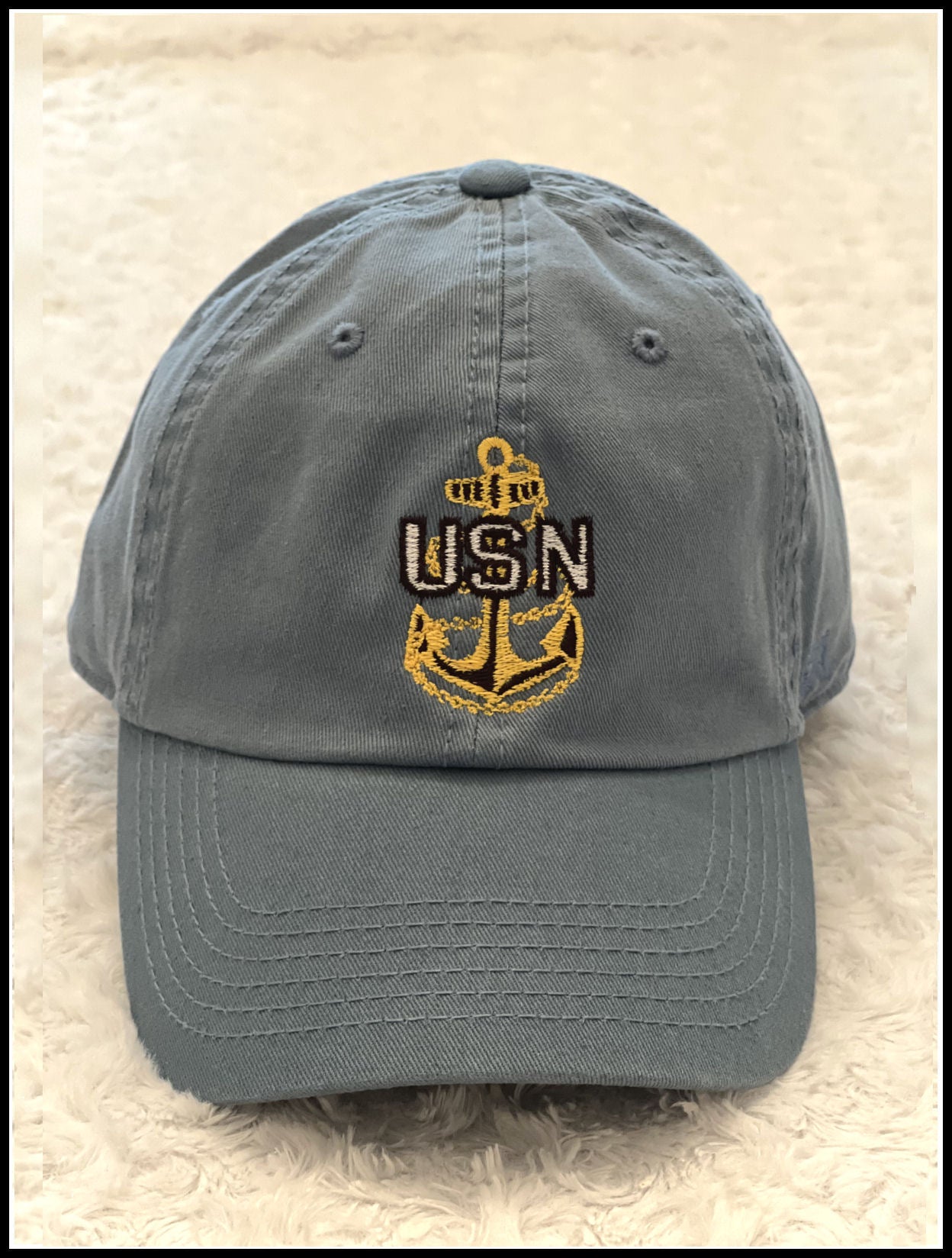 Denim Blue colored Cotton Twill hat with Gold Thread USN Anchor. Optional ”Chick Chief" or “Retired” Embroidery on the back of the hat.. Hats are adjustable, one size fits all.