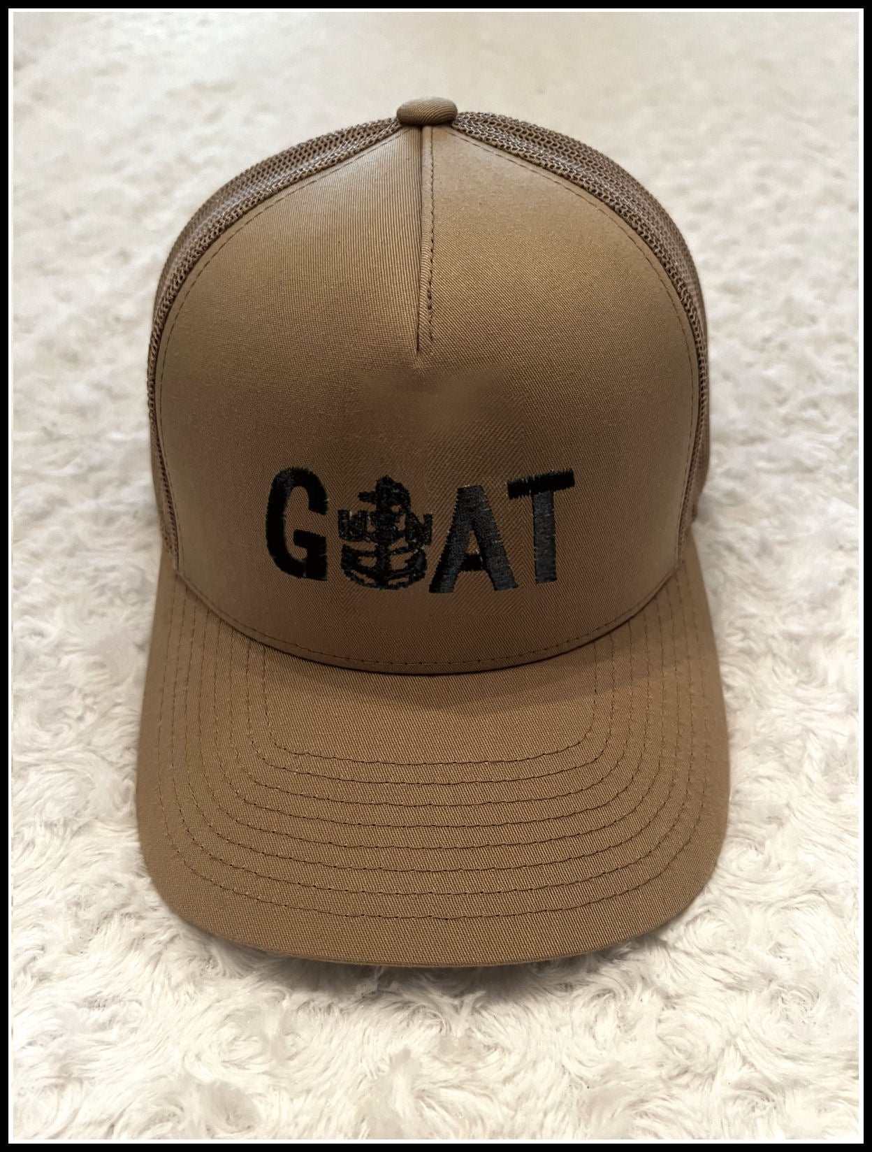 Khaki Trucker hat with Black GOAT design with USN Anchor.
