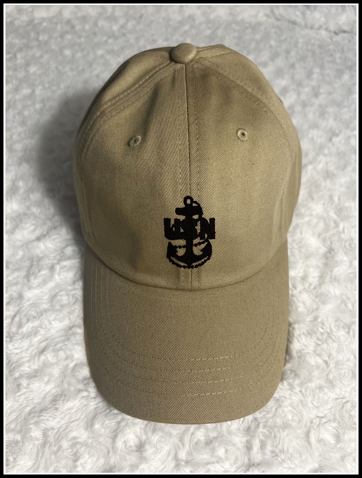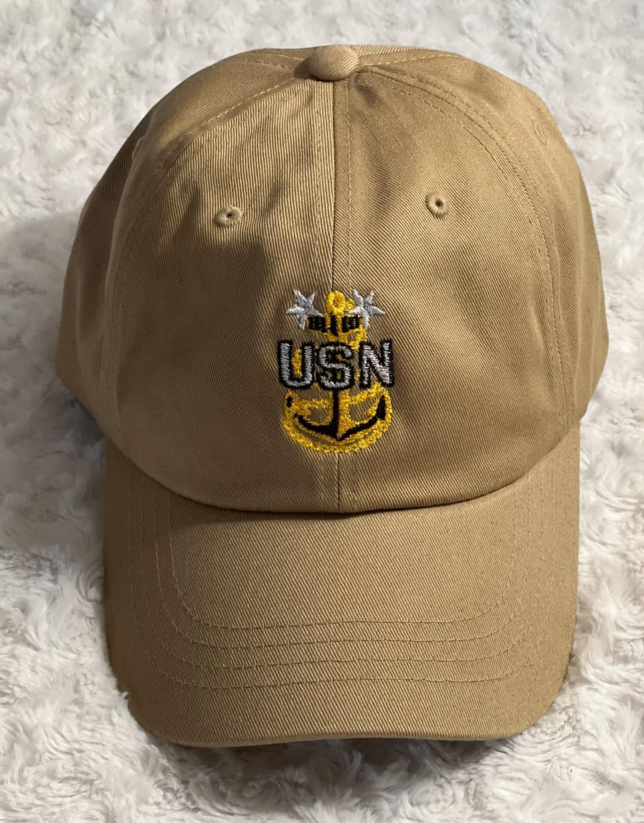 Khaki Cotton Twill Dad Cap with Embroidered Gold or Black Thread USN Anchor. Optional “Chick Chief” or “Retired” Embroidery on the back of the hat. Hats are adjustable, one size fits most.