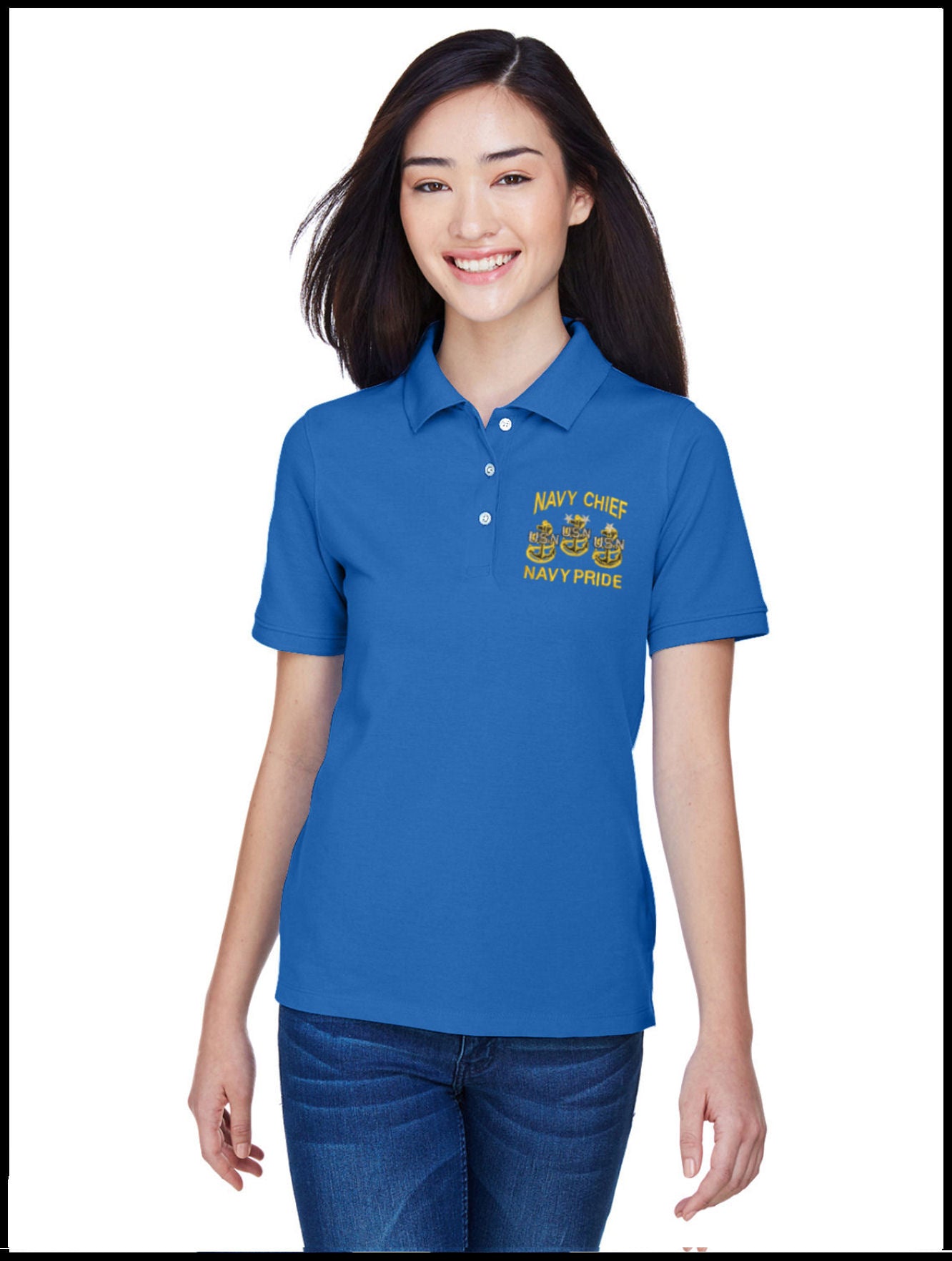 Ladies Royal Blue Piqué Polo shirt with Gold Navy Chief Navy Pride Embroidered Logo with all 3 Anchors.