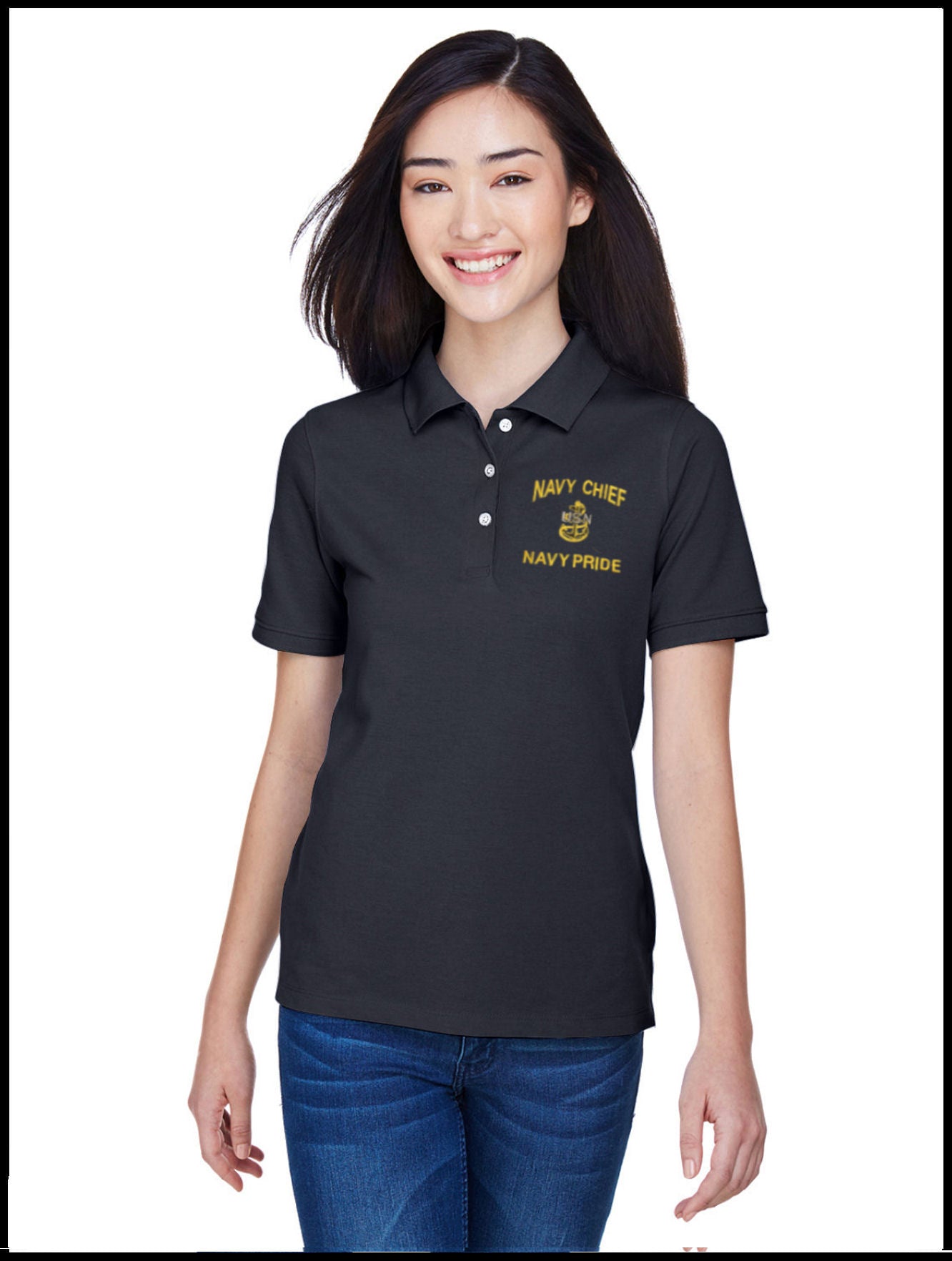 Ladies Navy Blue Polo shirt with Gold Navy Chief Navy Pride Embroidered Logo 1 Anchor.