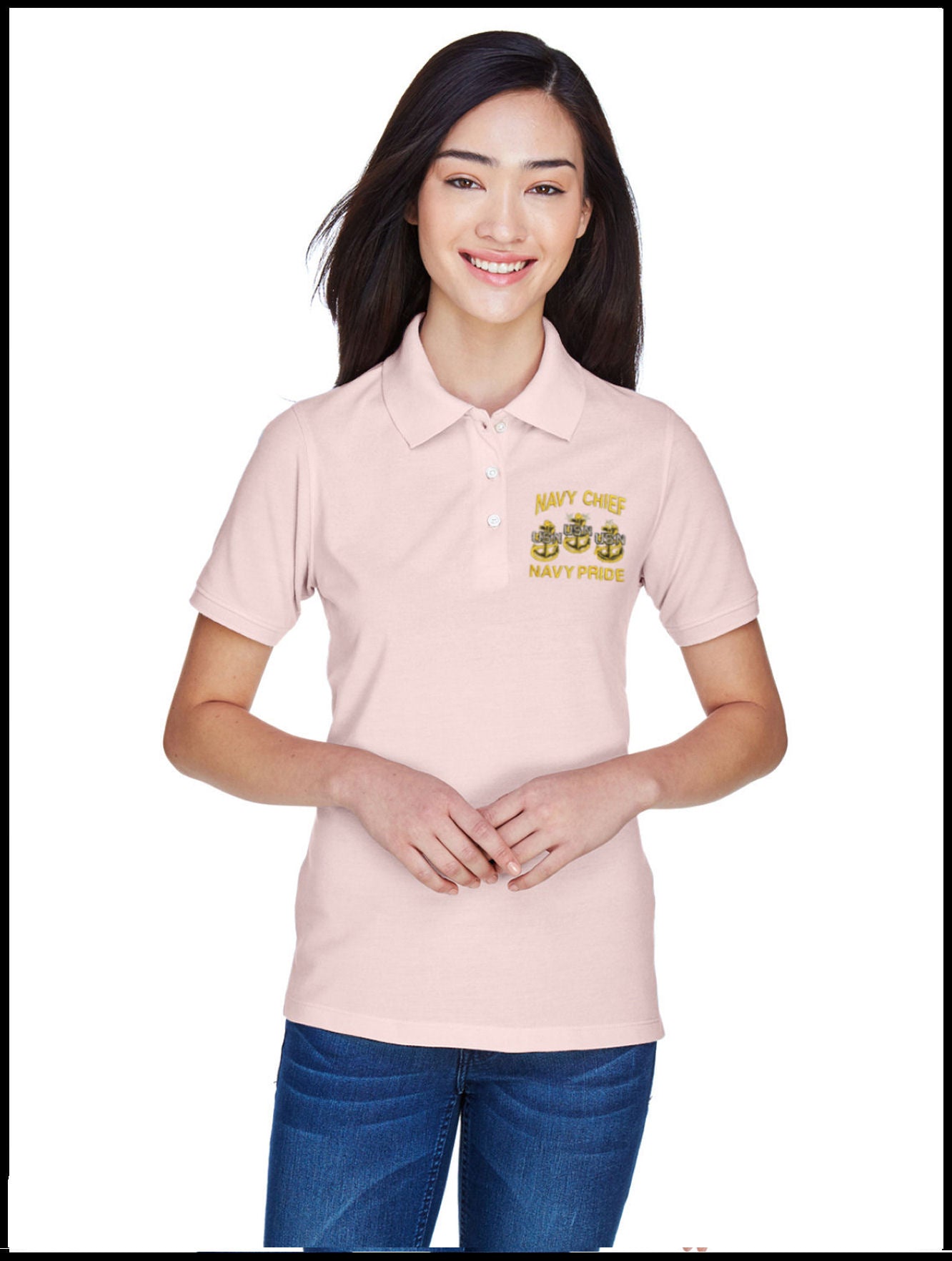 Ladies Blush Pink Polo shirt with Gold Navy Chief Navy Pride Embroidered Logo with all 3 Anchors.