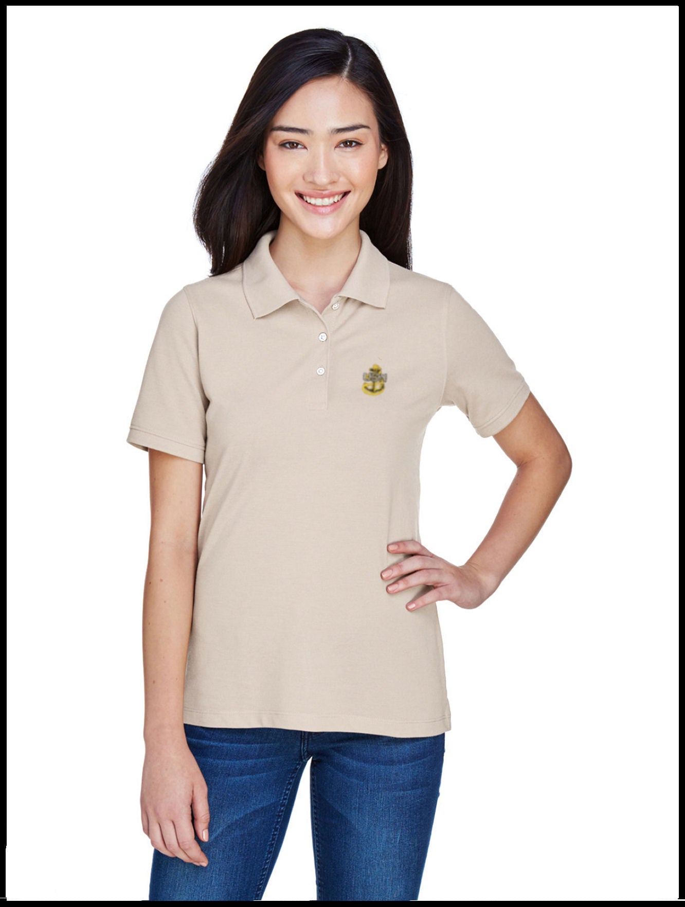 Ladies Tan Polo shirt with Gold Navy Chief Navy Anchor.