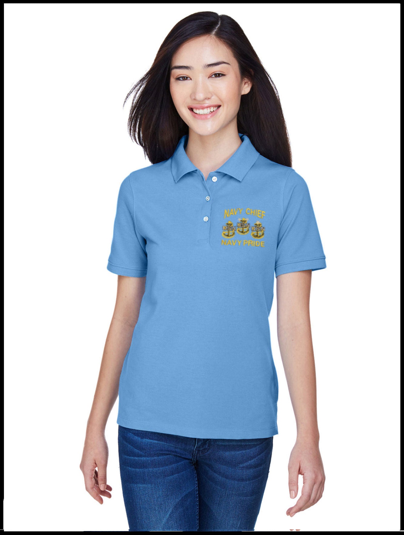Ladies Light Blue Piqué Polo shirt with Gold Navy Chief Navy Pride Embroidered Logo with all 3 Anchors.