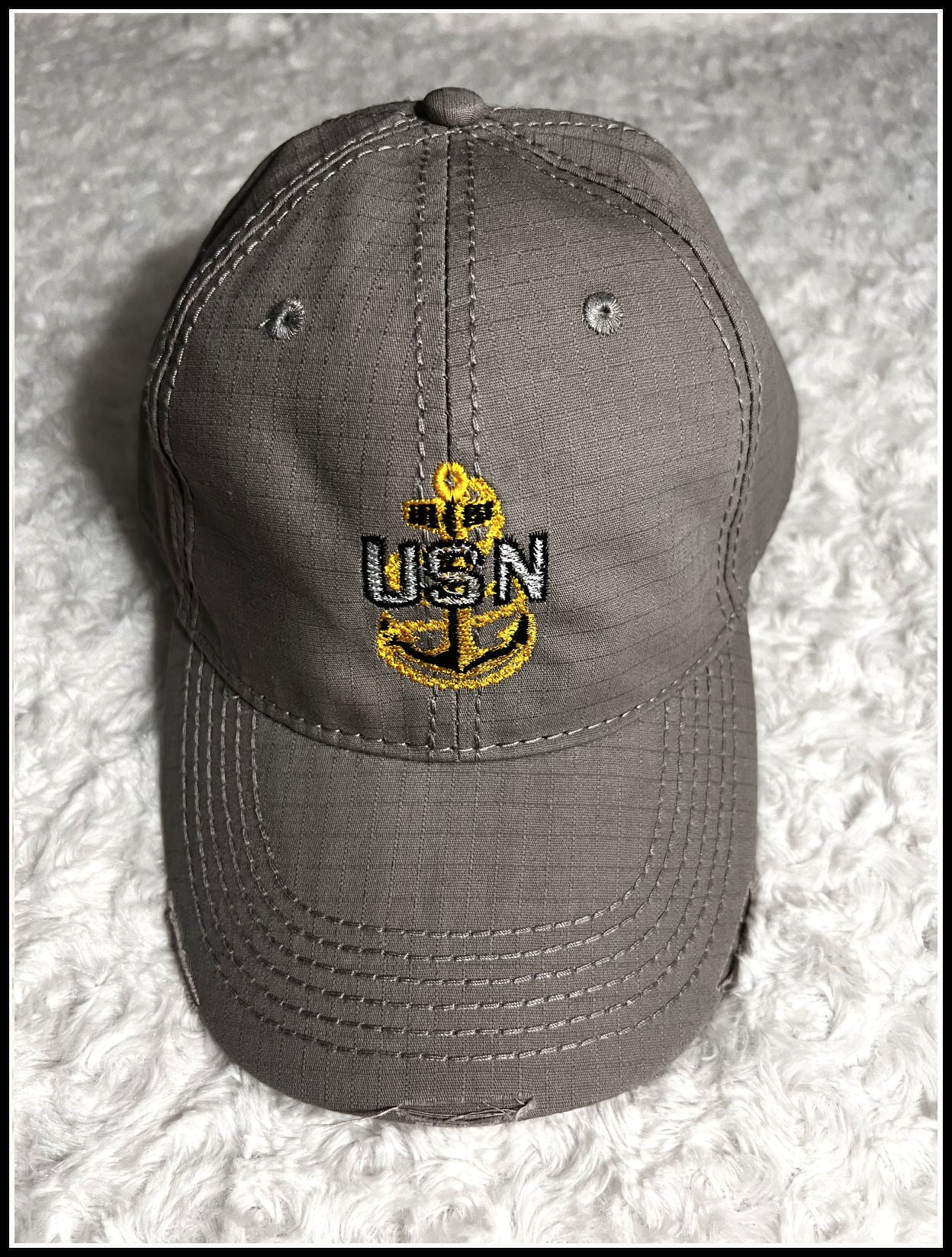 Grey Distressed hat with Gold Thread USN Anchor. Optional “Chick Chief" or “Retired” Embroidery on the back of the hat. Hats are adjustable, one size fits most.