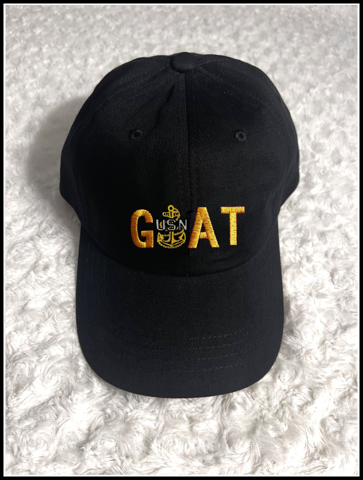 Black Cotton Twill Dad Cap with Gold GOAT design with Golden Yellow Thread USN Anchor. Optional “Chick Chief” or “Retired” Embroidery on the back of the hat. Hats are adjustable, one size fits most.