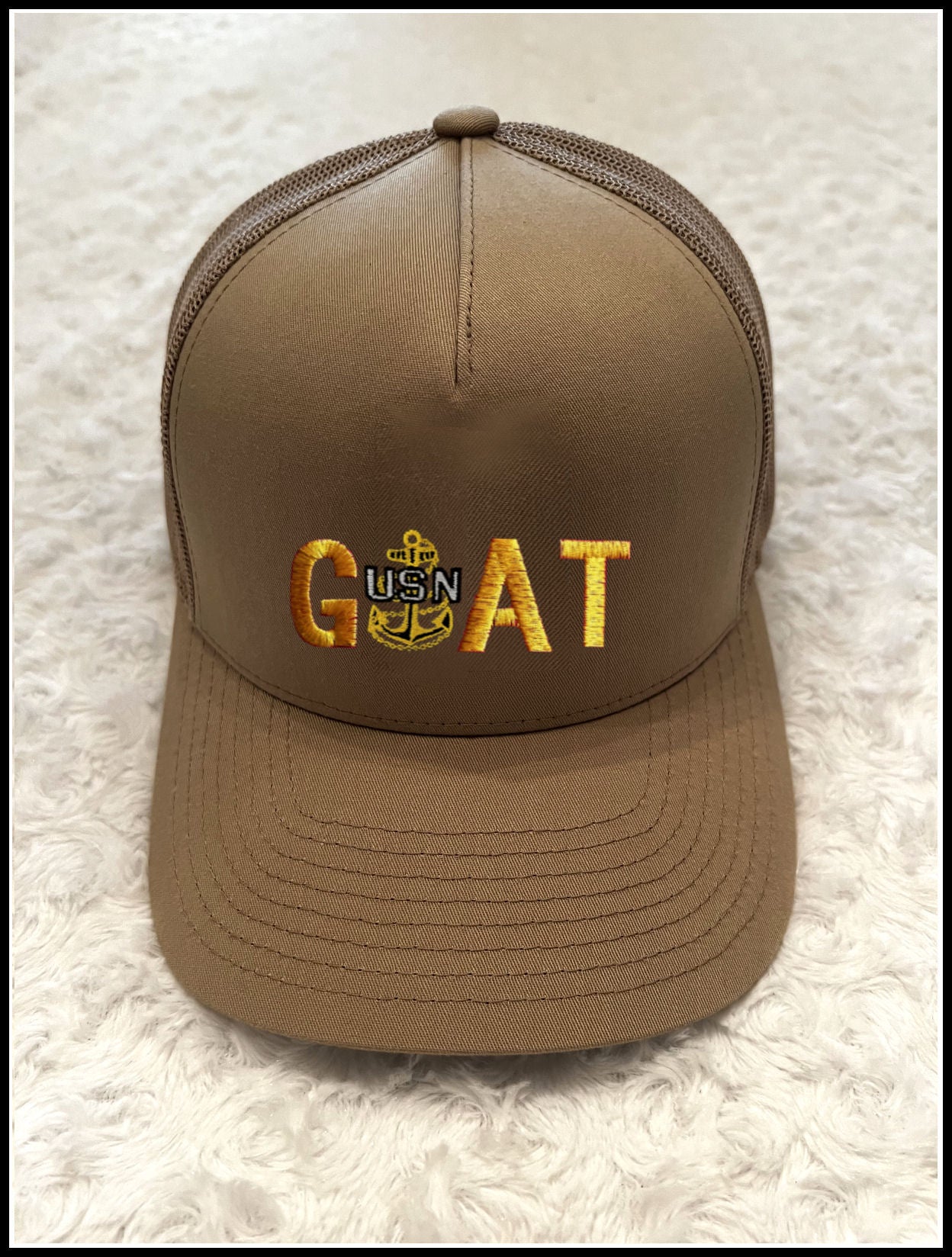 Navy Blue Trucker hat with Gold GOAT design with USN Anchor.