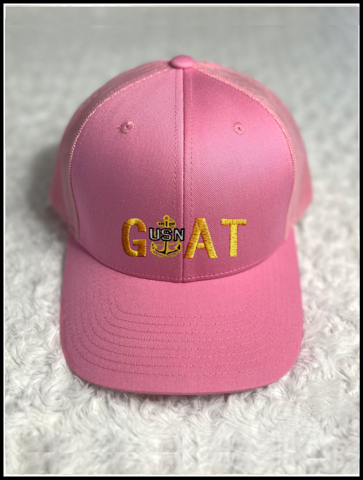 Pink Trucker hat with Gold GOAT design with USN Anchor.