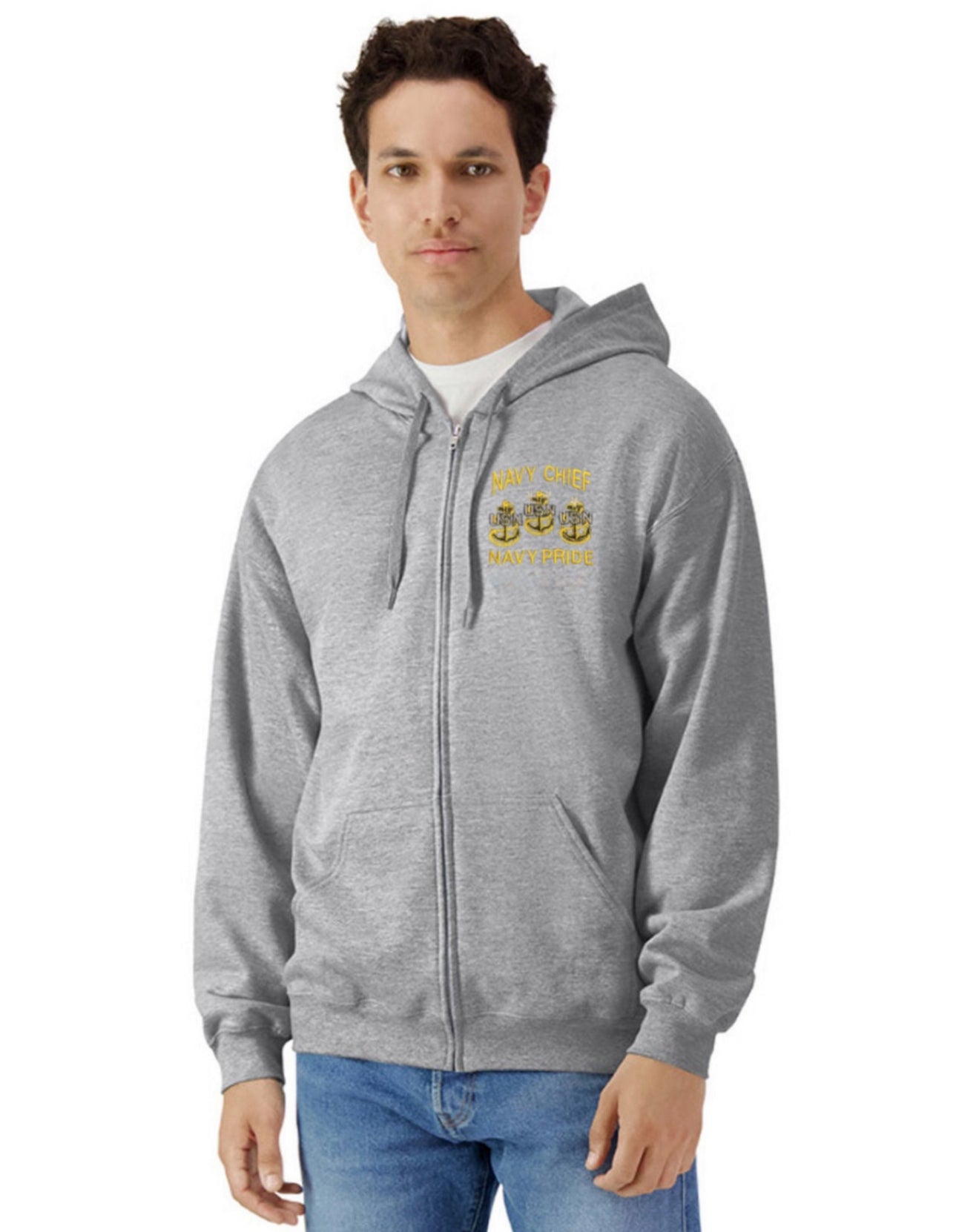 Navy Chief Navy Pride Embroidered Front Heather Grey Hooded Zip Sweatshirt
