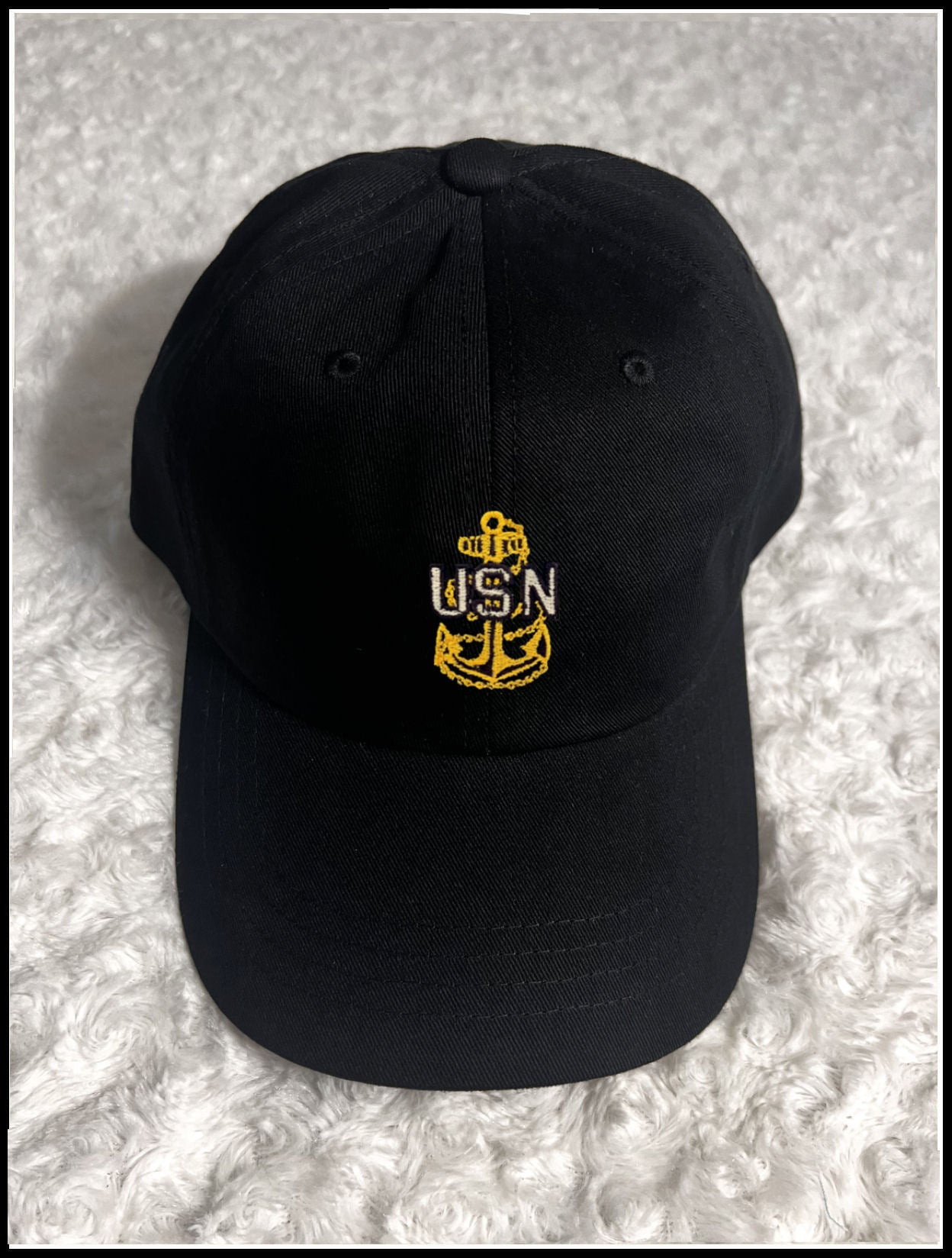 Black Cotton Twill Dad Cap with Embroidered Gold Thread USN Anchor. Optional “Retired” or “Chick Chief” Embroidery on the back of the hat. Hats are adjustable, one size fits most.