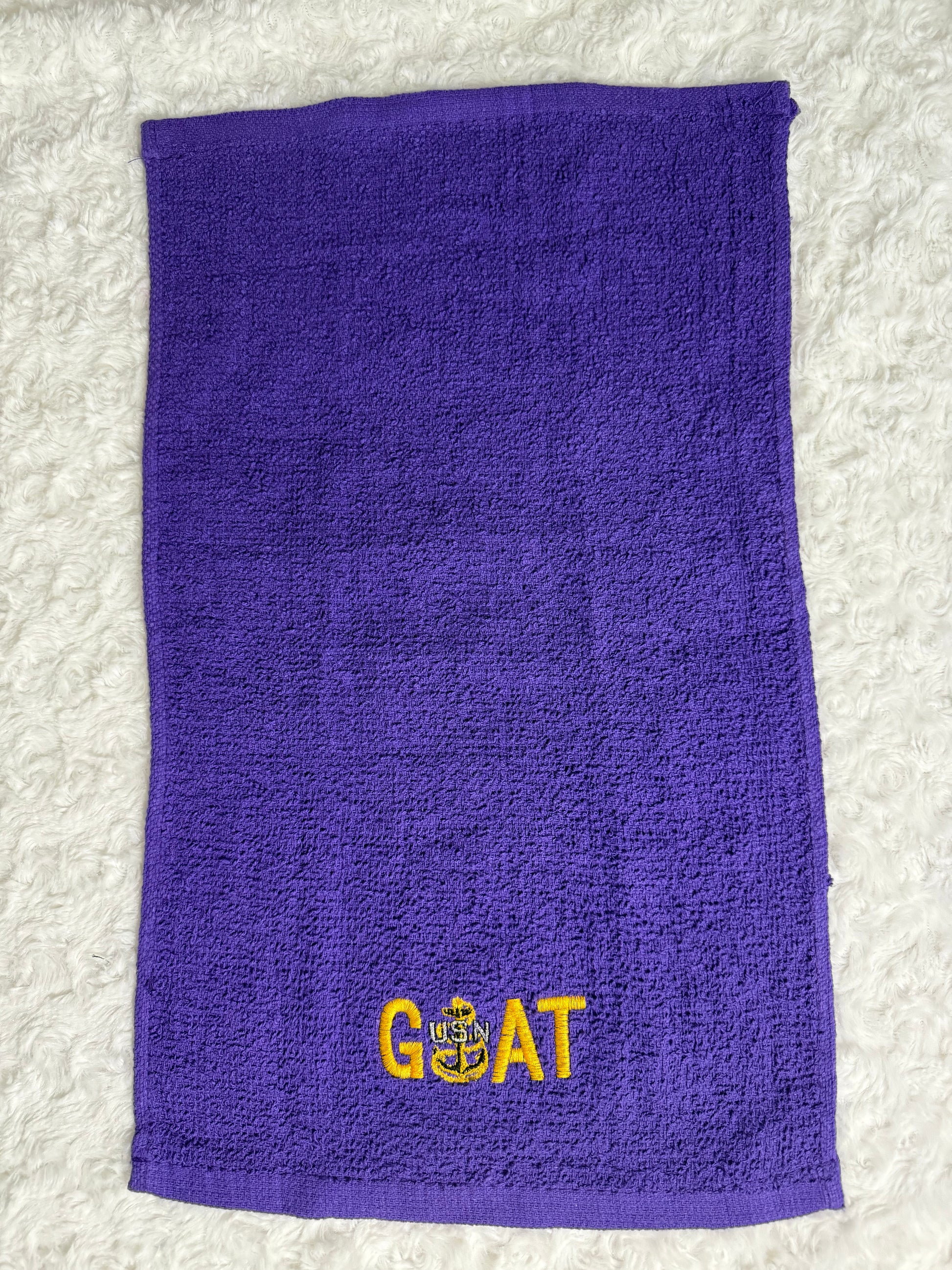 Terry Cloth 11x18 inch Gym Towel with Gold Embroidered GOAT with CPO Anchor Replacing the “O”