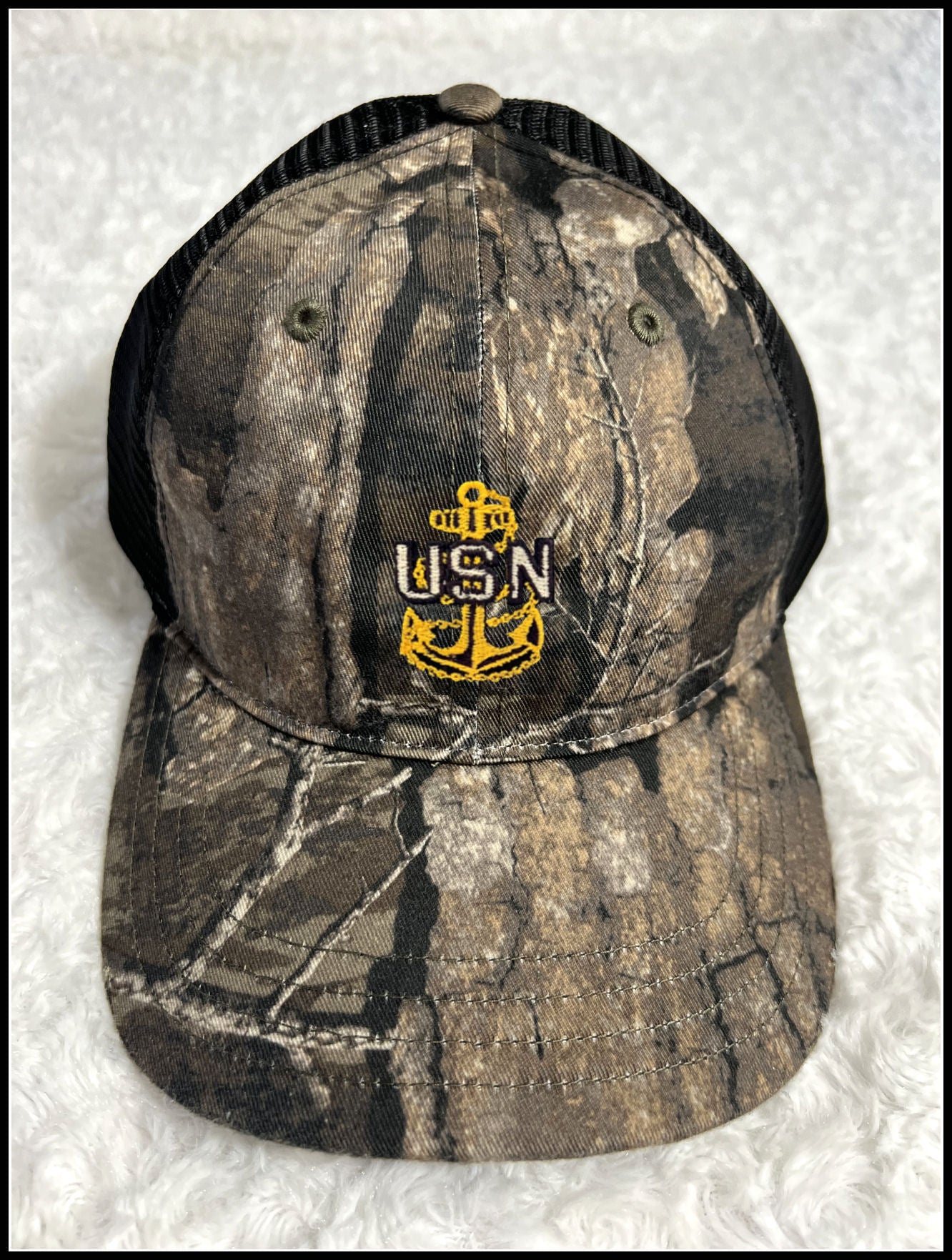 Real Tree Hunter Camo hat with Gold Thread USN Anchor and Black back. Hats are adjustable, one size fits most.
